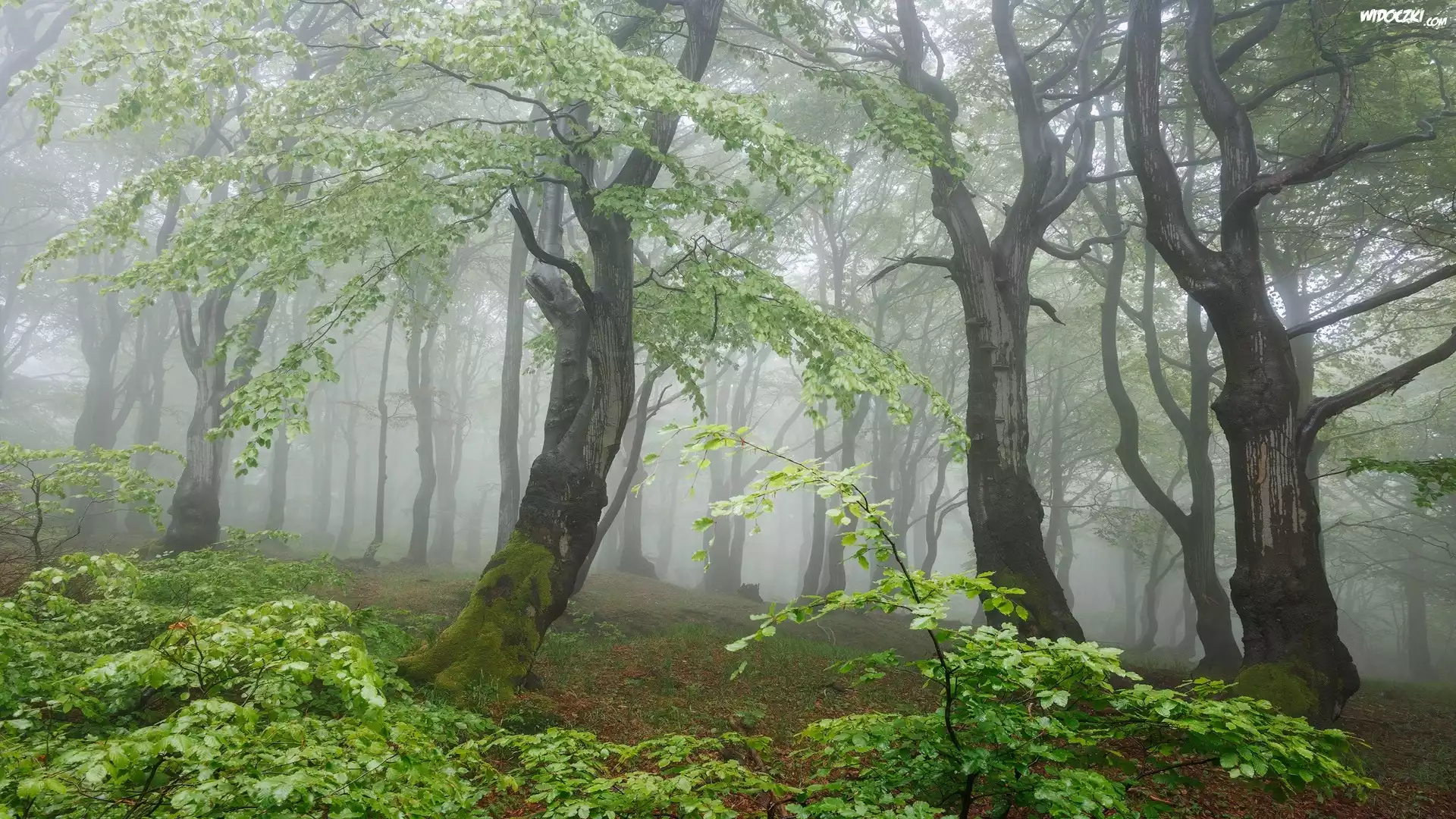 Zdjęcia, Las, Zielone, Drzewa, Liściaste, Mgła