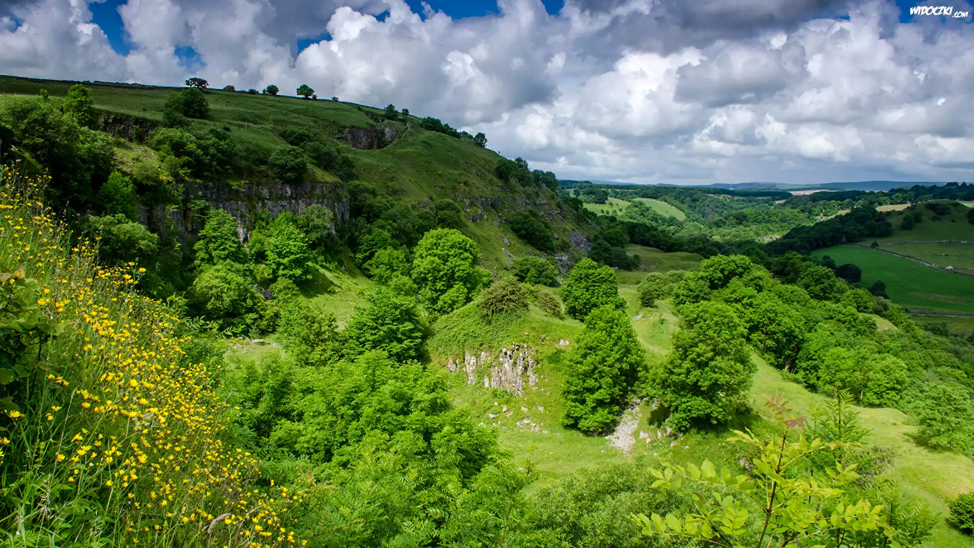 Zdjęcia, Zielone, Wzgórza, Drzewa, Trawa, Krzewy, Chmury
