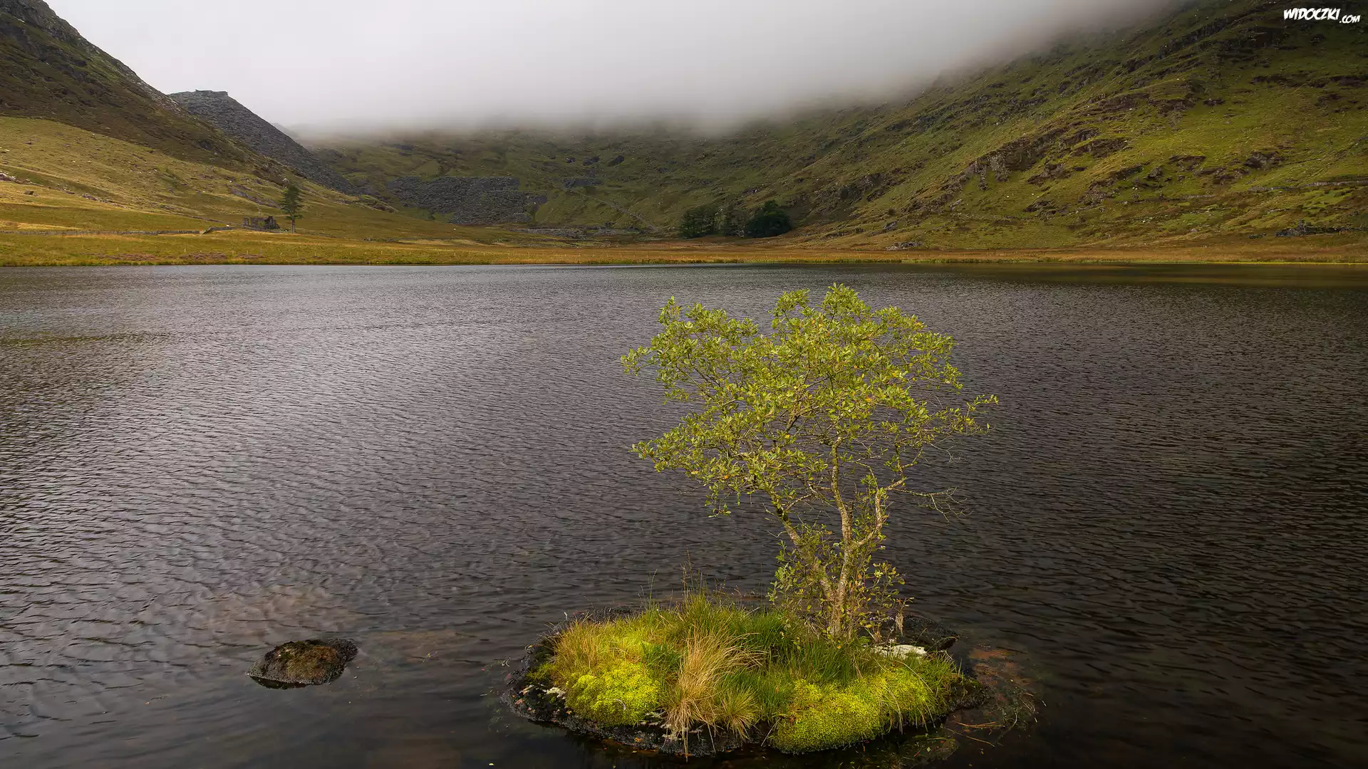 Zdjęcia, Wysepka, Drzewo, Jezioro, Zielone, Wzgórza, Mgła