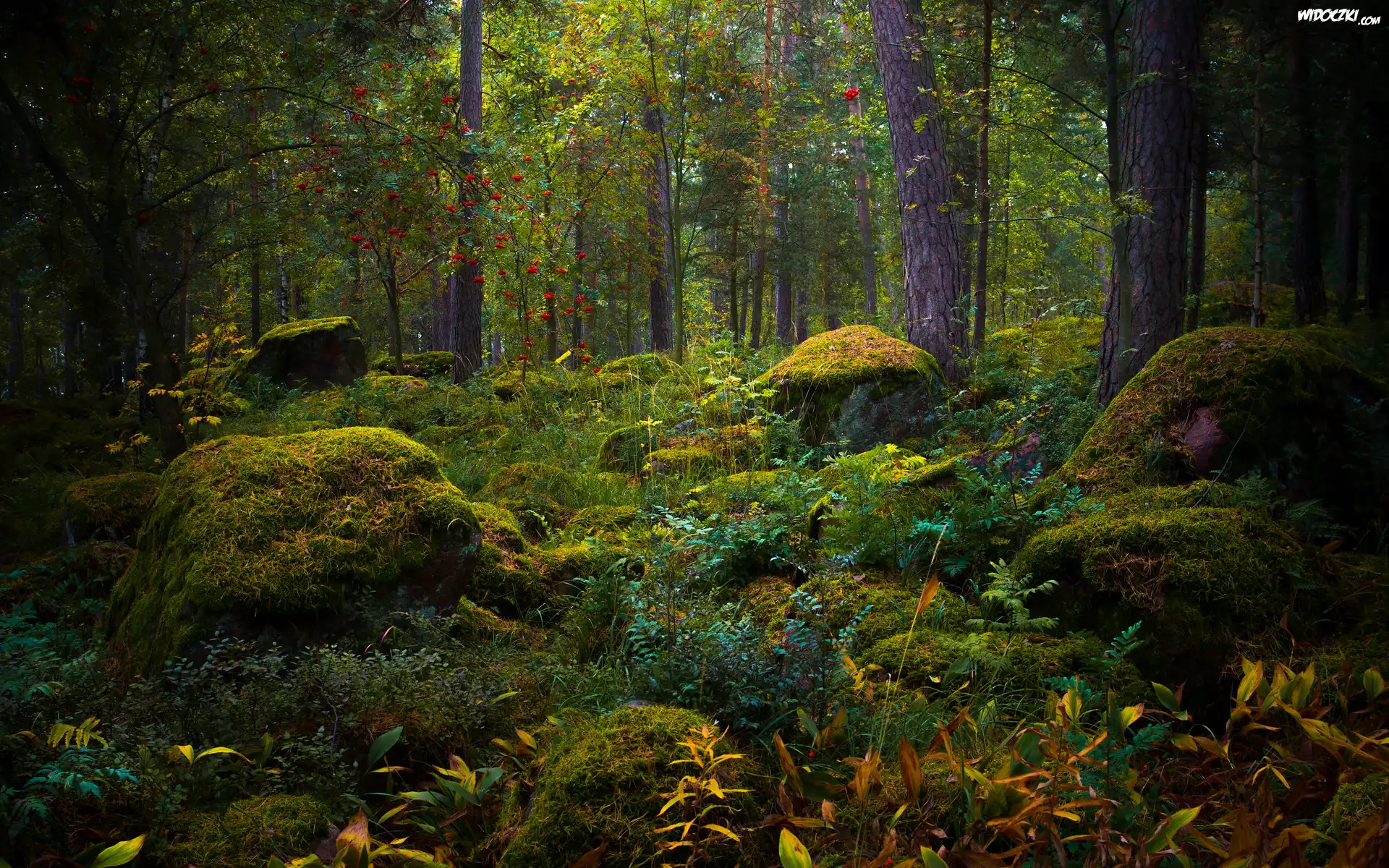 Zdjęcia, Zielony, Las, Drzewa, Omszałe, Kamienie