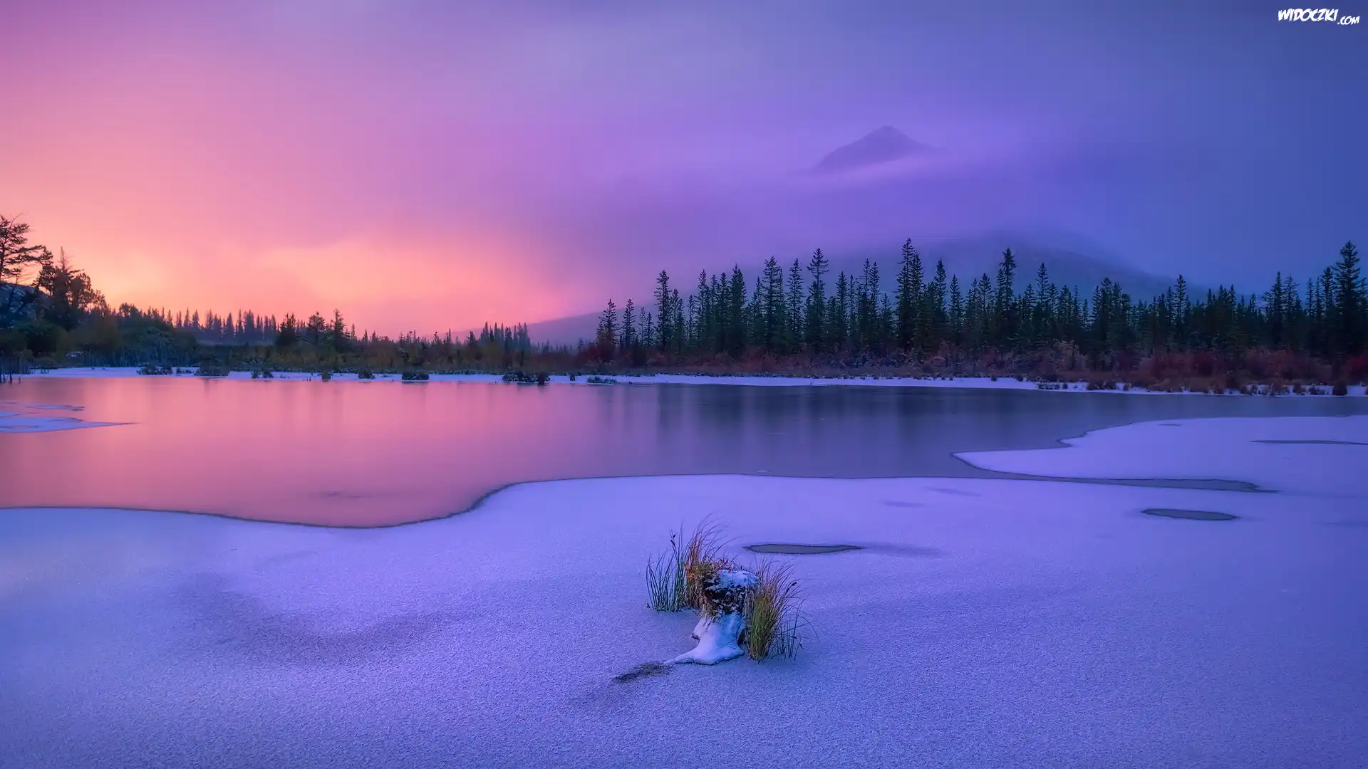 Zima, Jezioro, Vermilion Lake, Szczyt, Góry, Canadian Rockies, Park Narodowy Banff, Drzewa, Mgła, Alberta, Kanada |