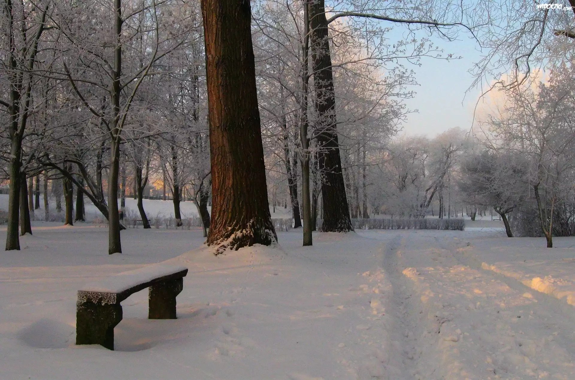 Zima, Park, Drzewa, Ławka, Śnieg