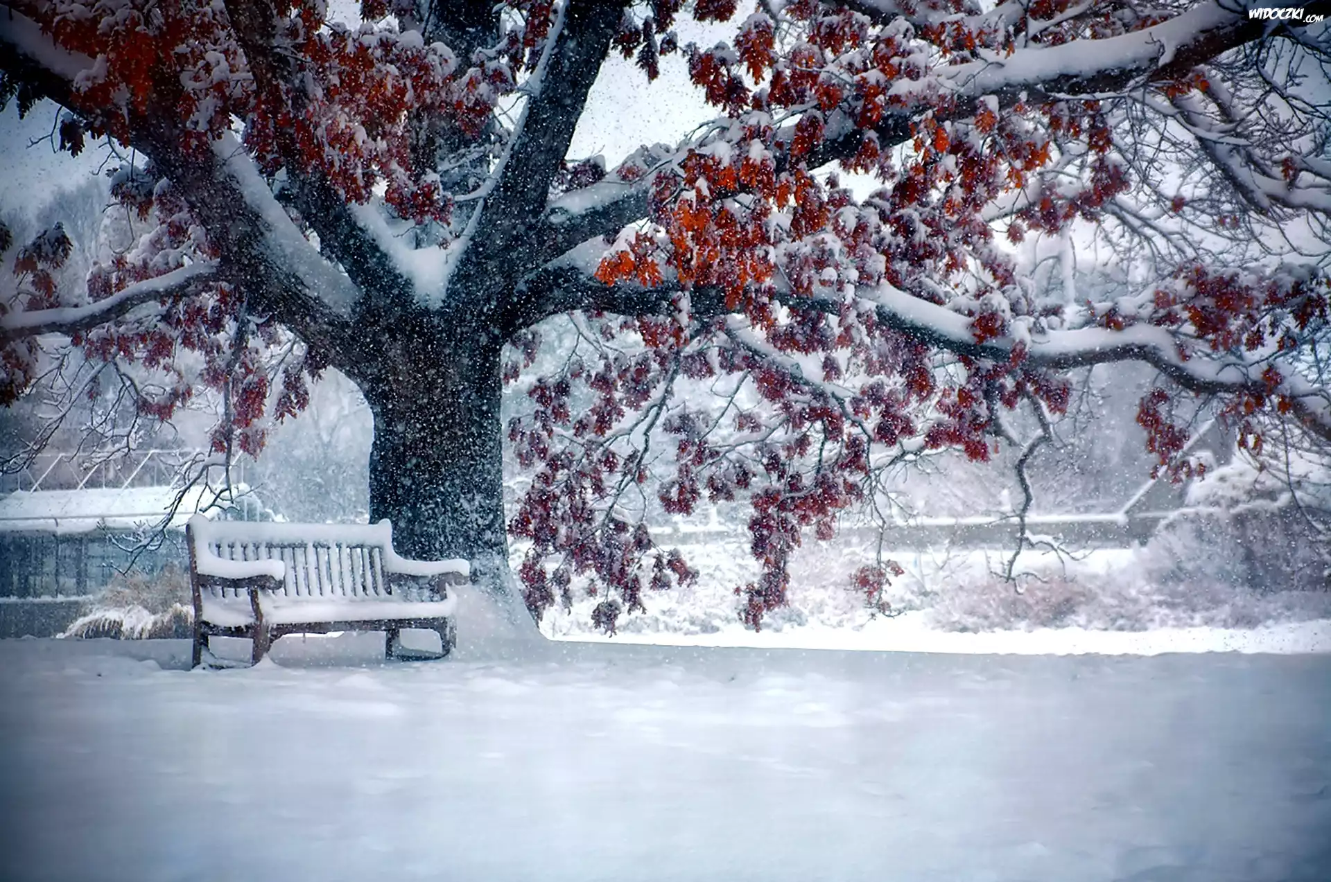 Zima, Ośnieżone, Drzewo, Ławka, Park