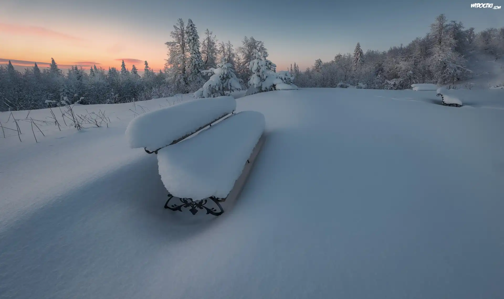 Zdjęcia, Zima, Park, Zaśnieżona, Ławka, Drzewa