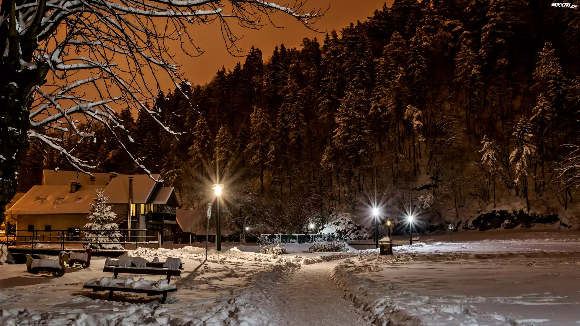Zdjęcia, Zima, Drzewa, Dom, Latarnie, Ławki, Chorwacja