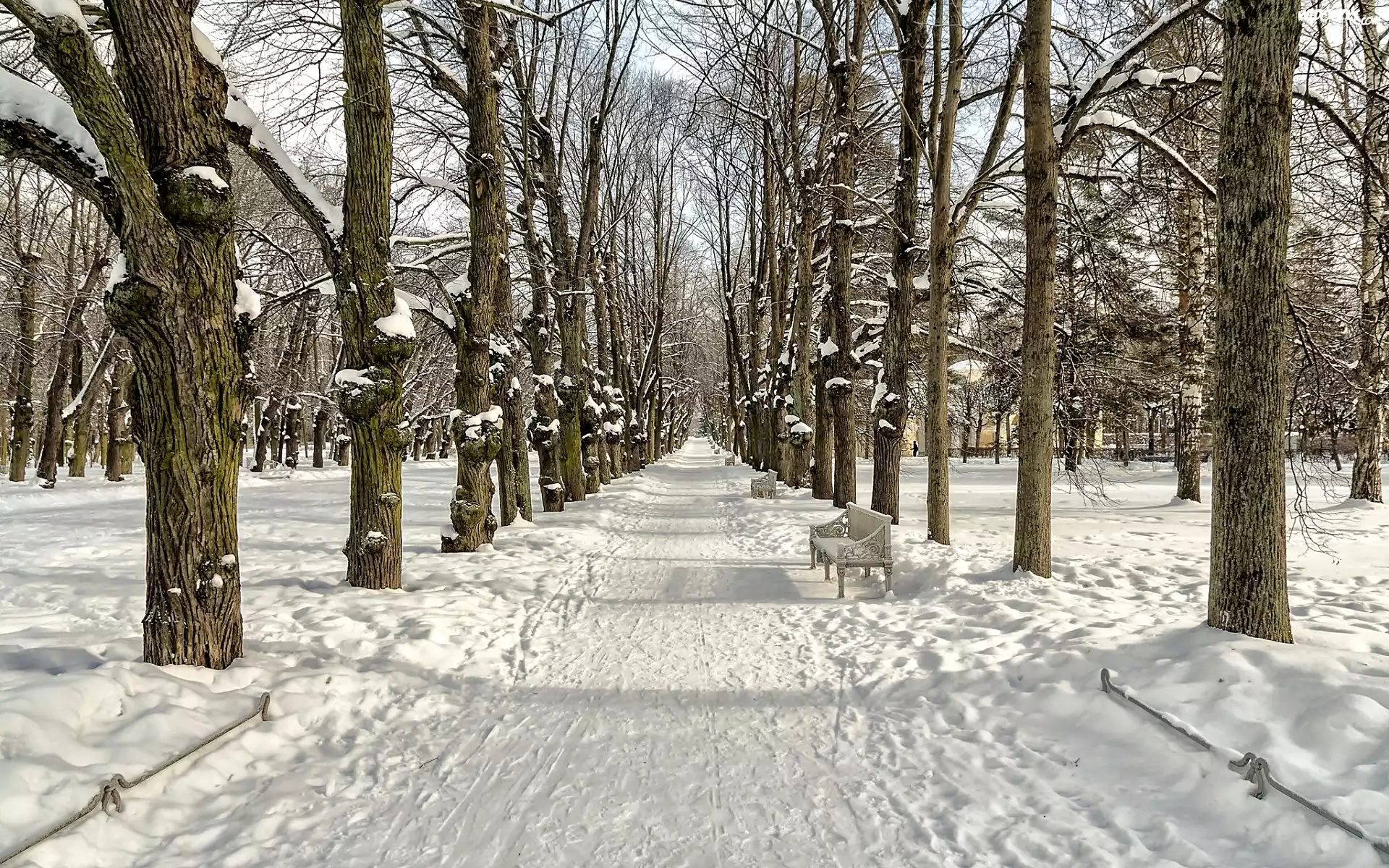 Zdjęcia, Zima, Park, Droga, Ławki, Drzewa