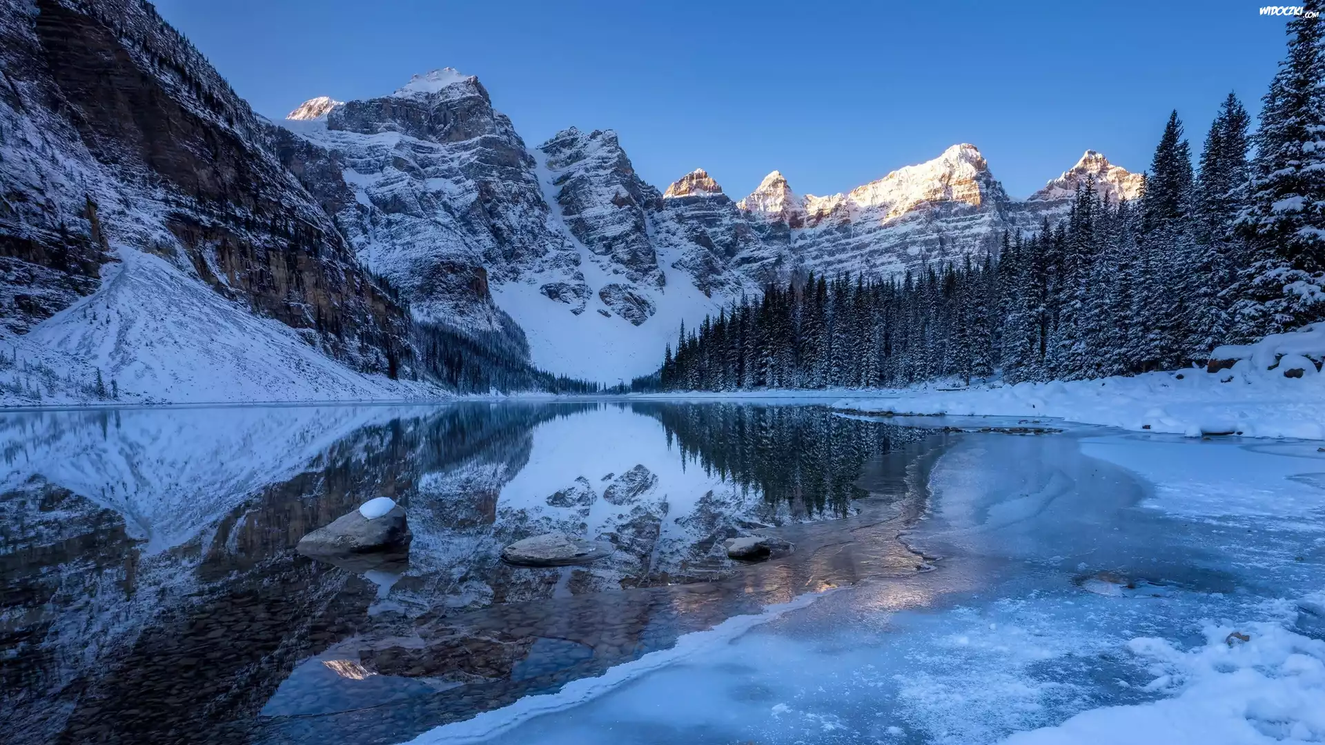 Zdjęcia, Kanada, Alberta, Park Narodowy Banff, Jezioro Moraine, Góry, Lasy, Zima