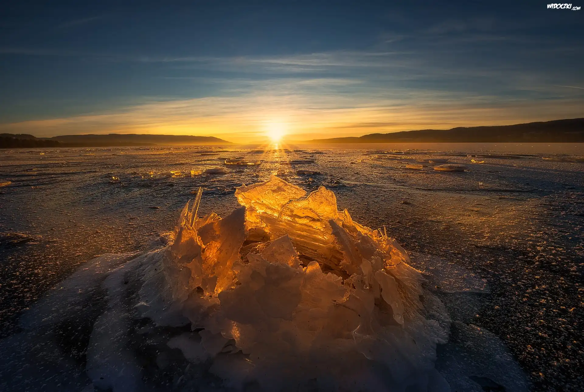 Zdjęcia, Zima, Zachód słońca, Jezioro, Bryła, Lodu
