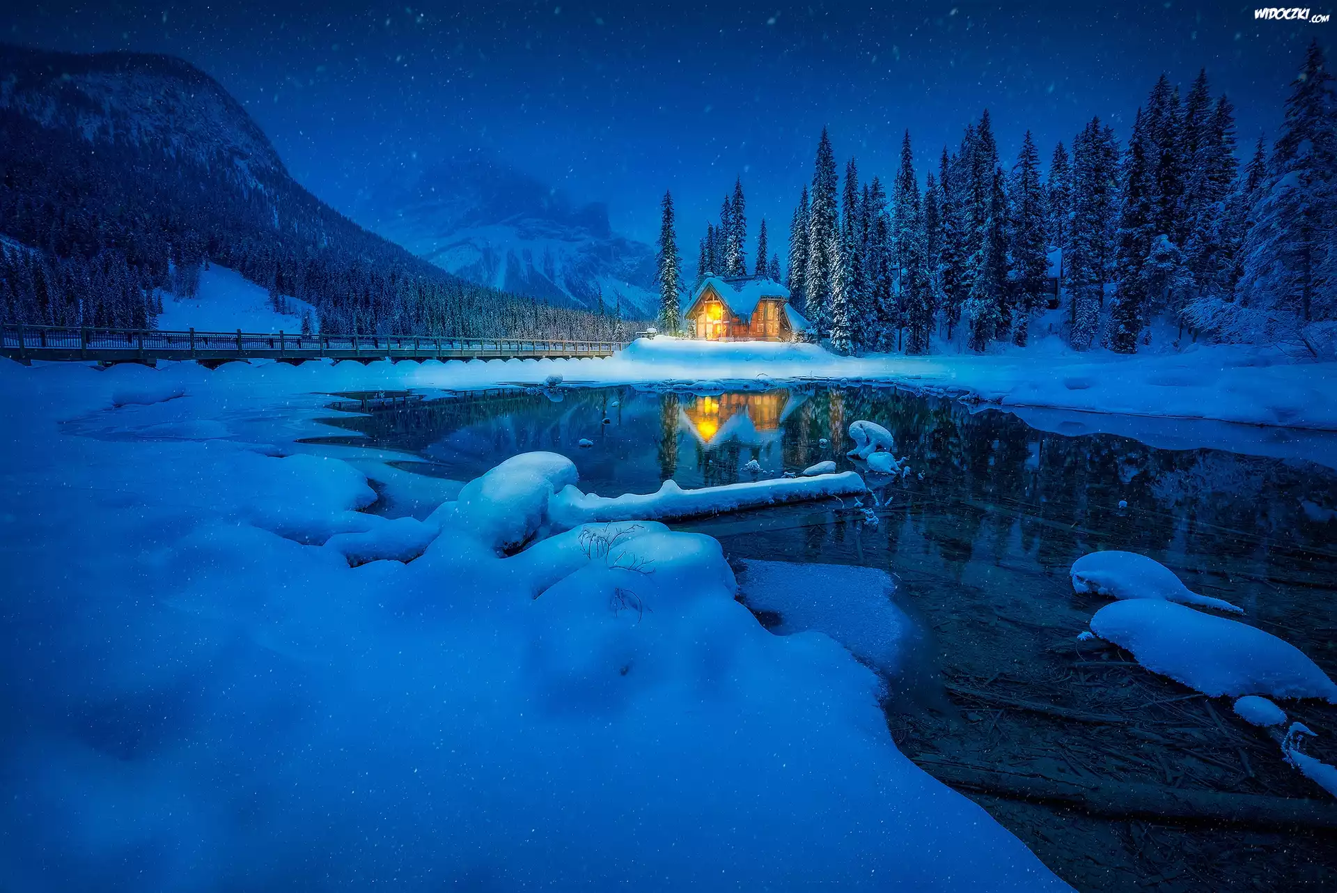 Zima, Park Narodowy Yoho, Jezioro Emerald Lake, Dom, Most, Góry, Las, Prowincja Kolumbia Brytyjska, Kanada |