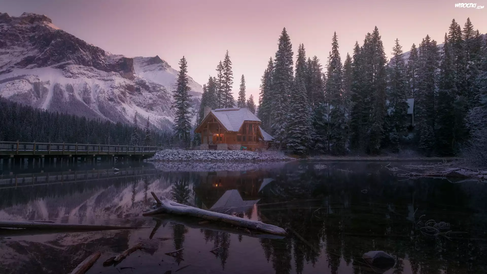 Zima, Park Narodowy Yoho, Jezioro Emerald Lake, Dom, Most, Góry, Drzewa, Las, Prowincja Kolumbia Brytyjska, Kanada |