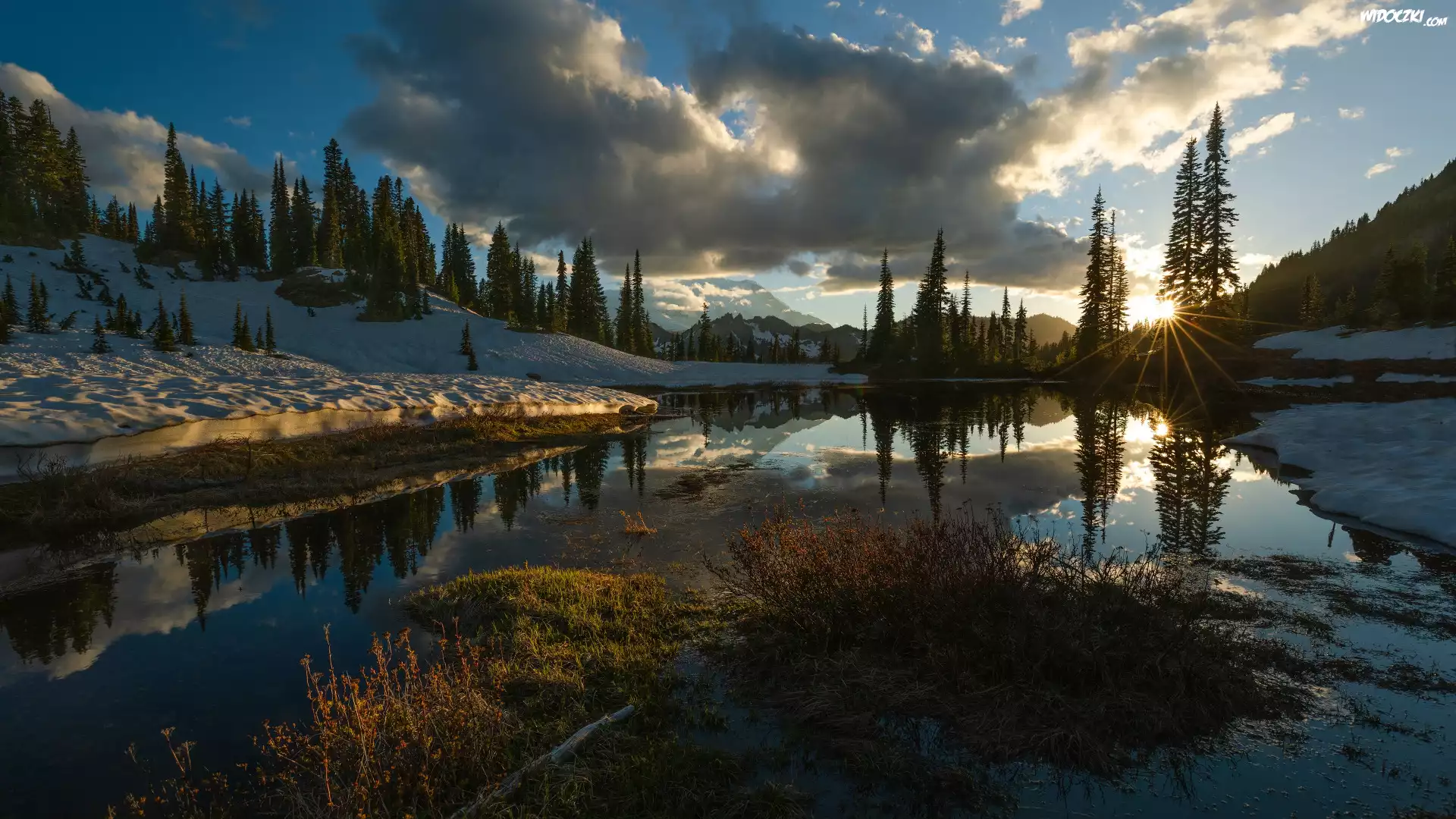 Zima, Las, Jezioro, Góry, Śnieg, Drzewa, Chmury, Wschód słońca