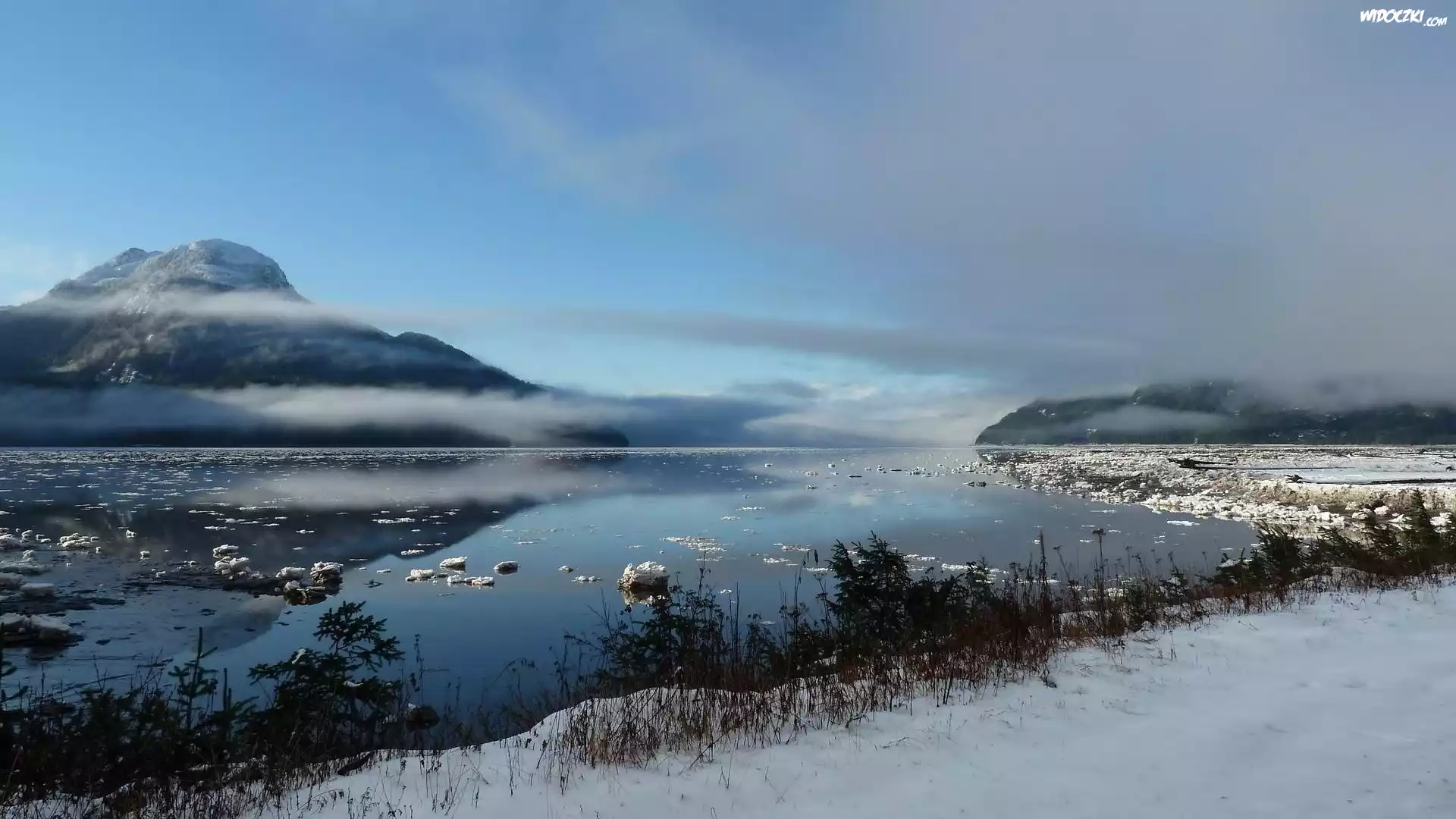 Zima, Góry, Jezioro, Chmury, Iglaki