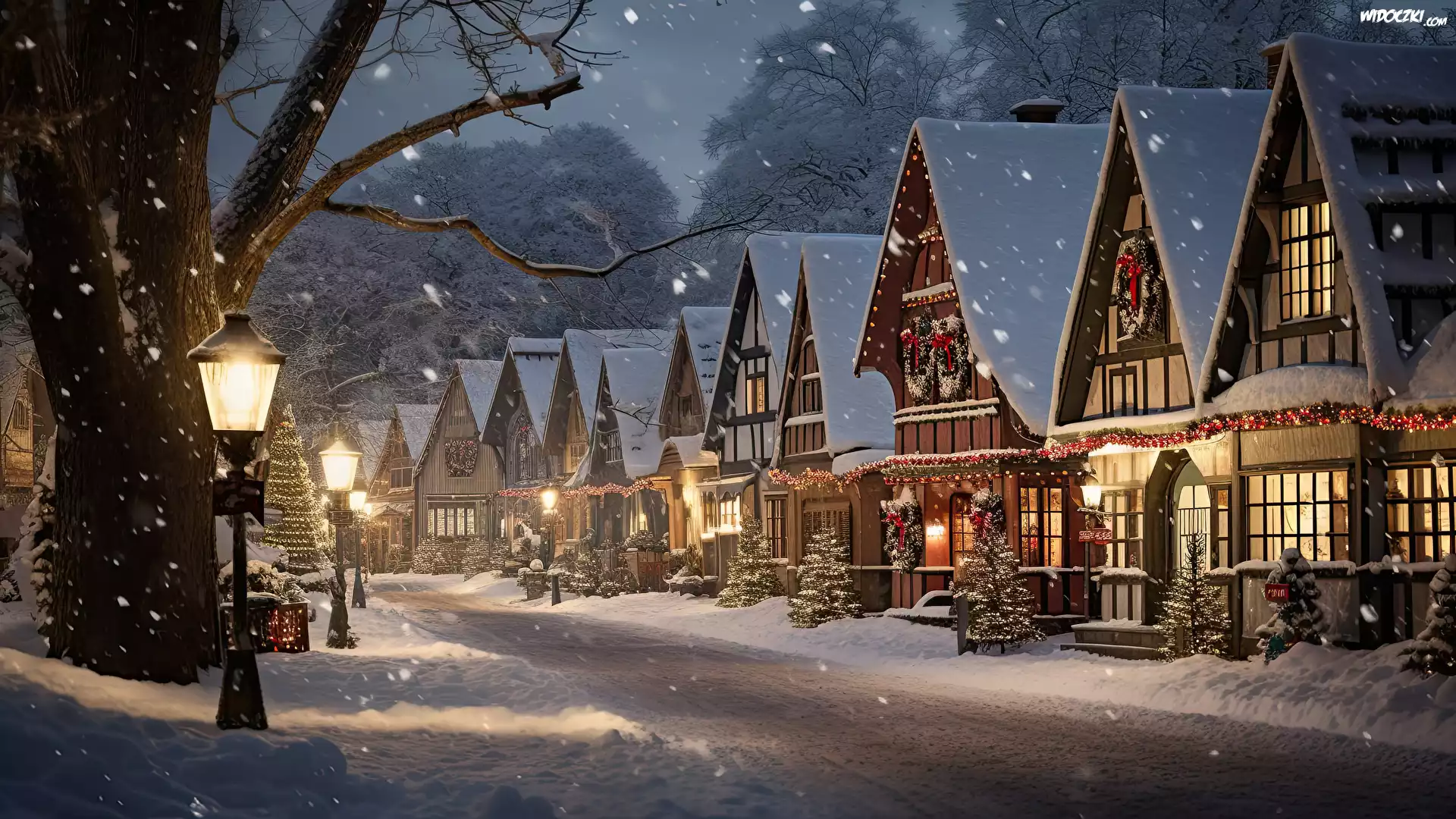 Zdjęcia, Oświetlone, Domy, Choinki, Ośnieżona, Ulica, Drzewa, Latarnie Zima