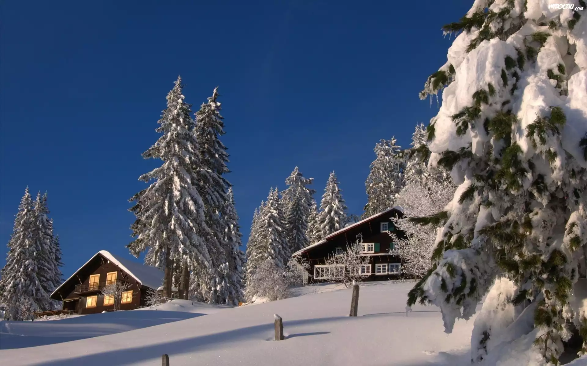 Zdjęcia, Zima, Domy, Ośnieżone, Iglaki, Czyste, Niebo