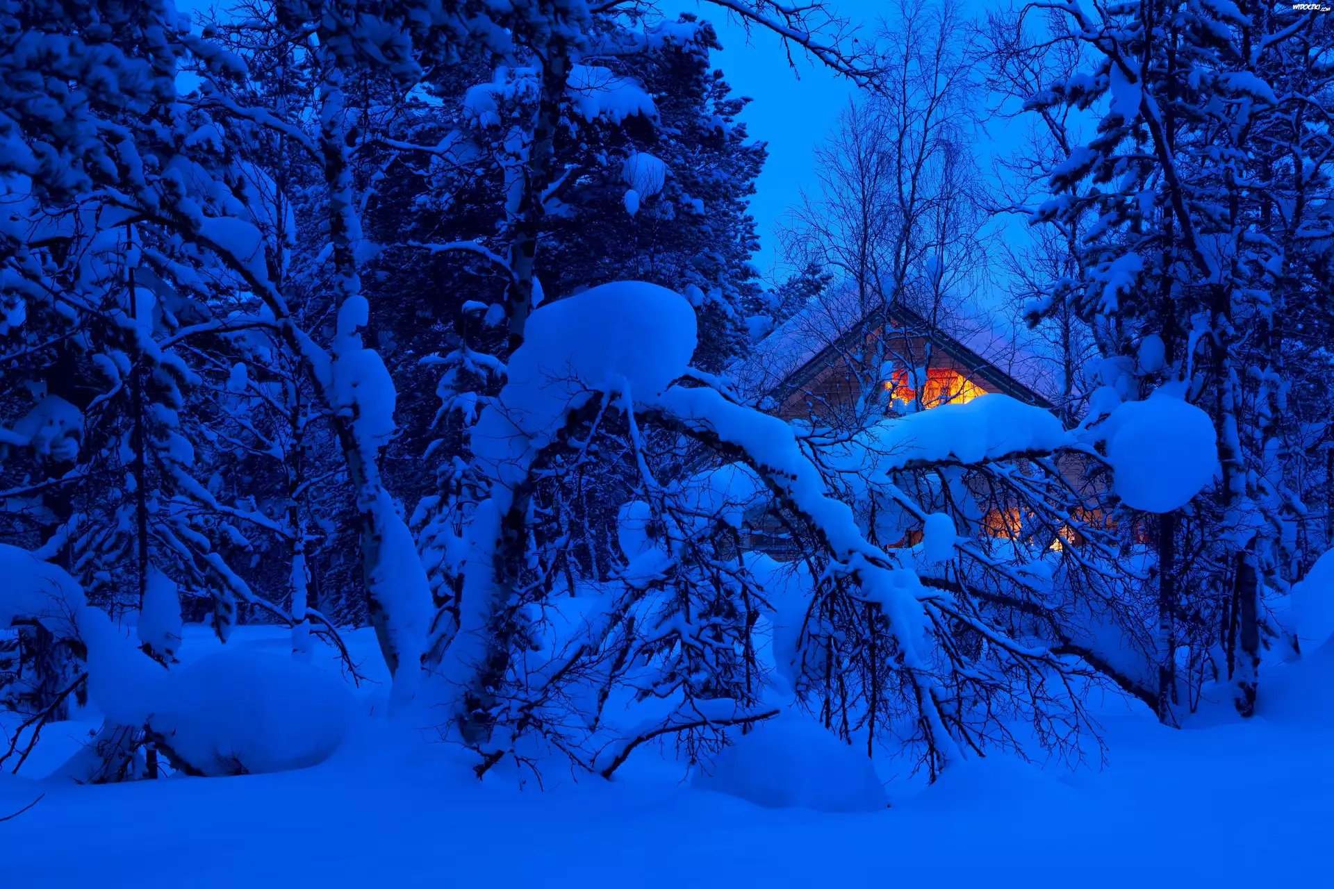 Zima, Ośnieżone, Drzewa, Dom, Zmrok