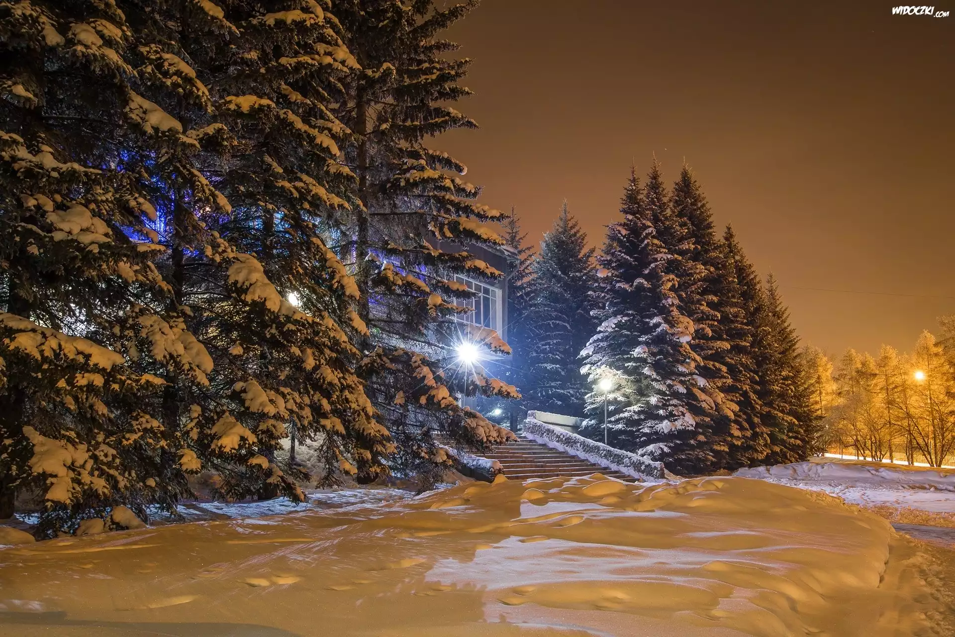 Zdjęcia, Zima, Oświetlony, Dom, Schody