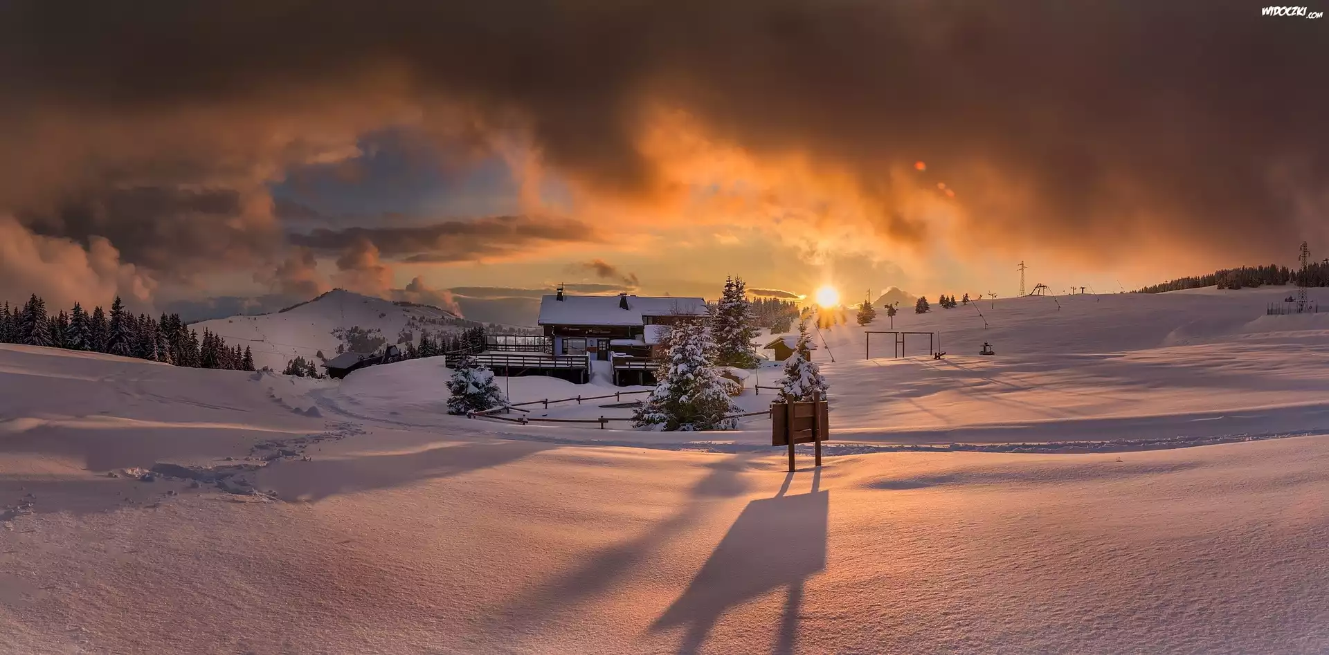 Zima, Zachód słońca, Dom, Wzgórza