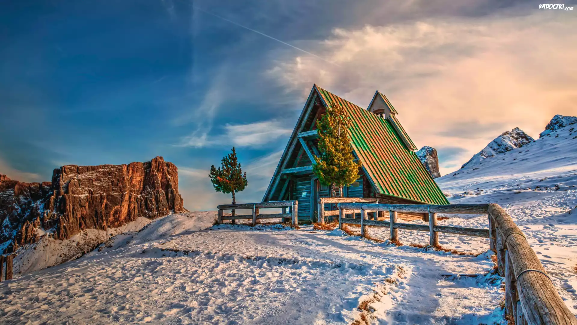 Zdjęcia, Włochy, Dolomity, Góry, Śnieg, Dom, Ogrodzenie, Skały, Drzewa, Chmury, Zima