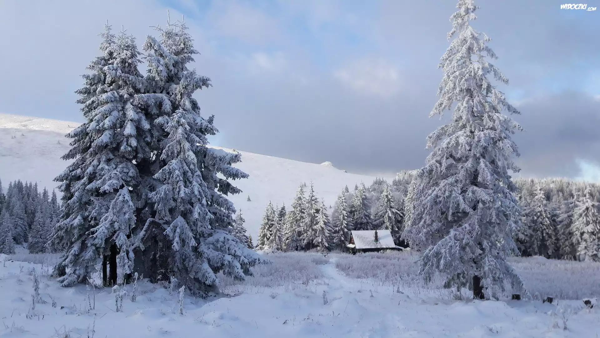 Zdjęcia, Zima, Góry, Świerki, Drzewa, Dom, Schronisko