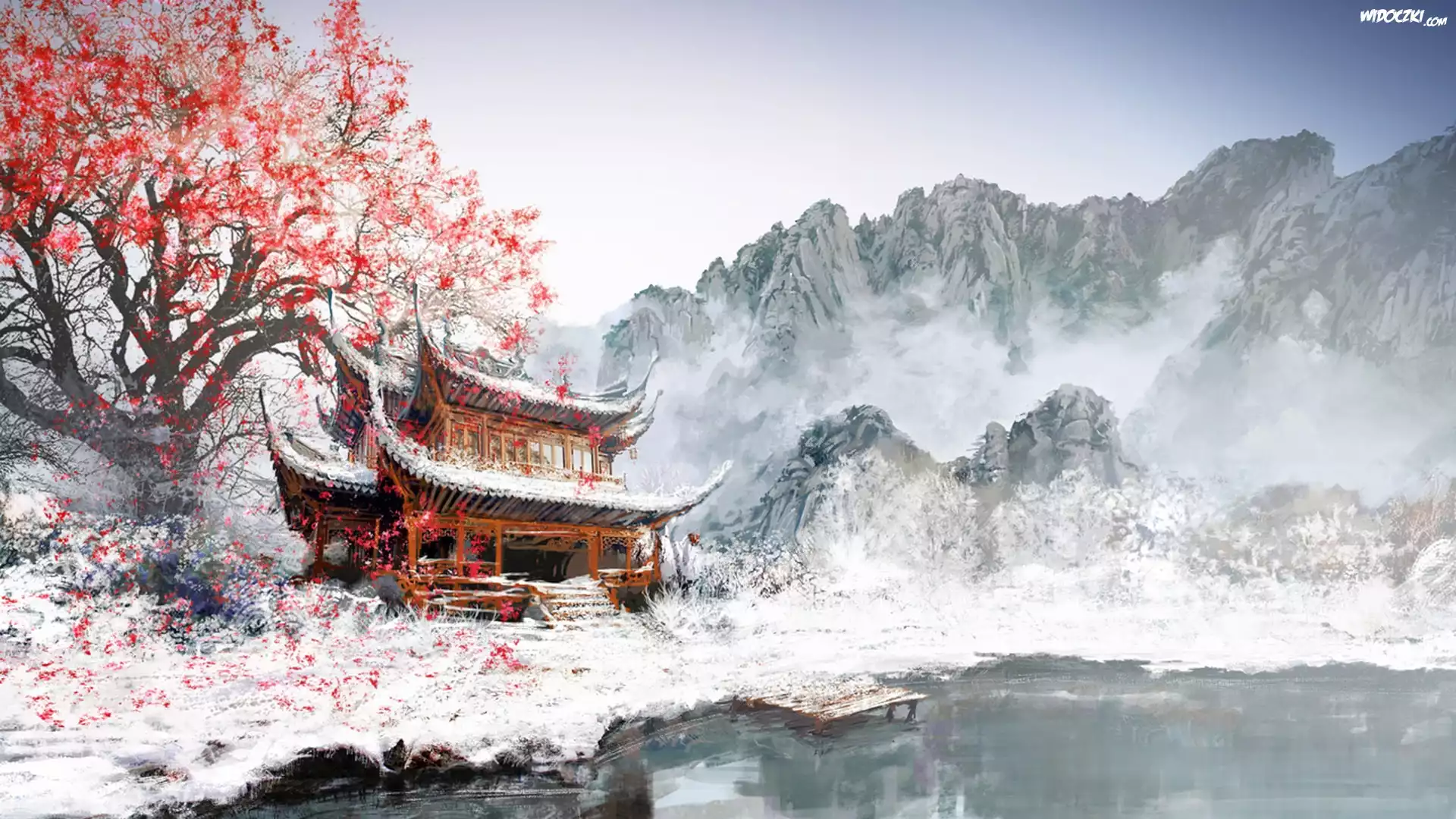 Zdjęcia, Zima, Góry, Drzewo, Domek, Japoński