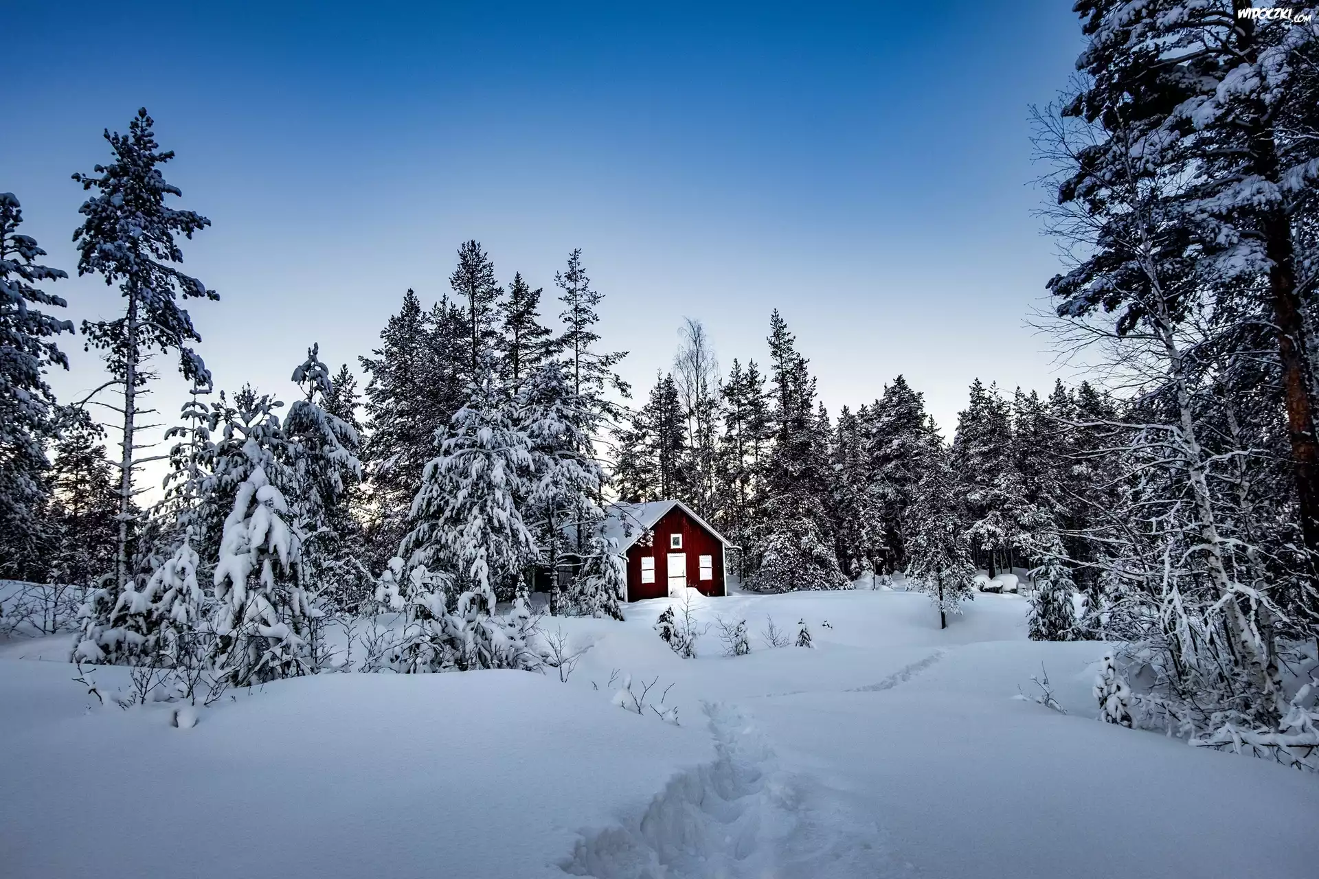 Zdjęcia, Zima, Ośnieżone, Świerki, Drewniany, Domek, Ścieżka