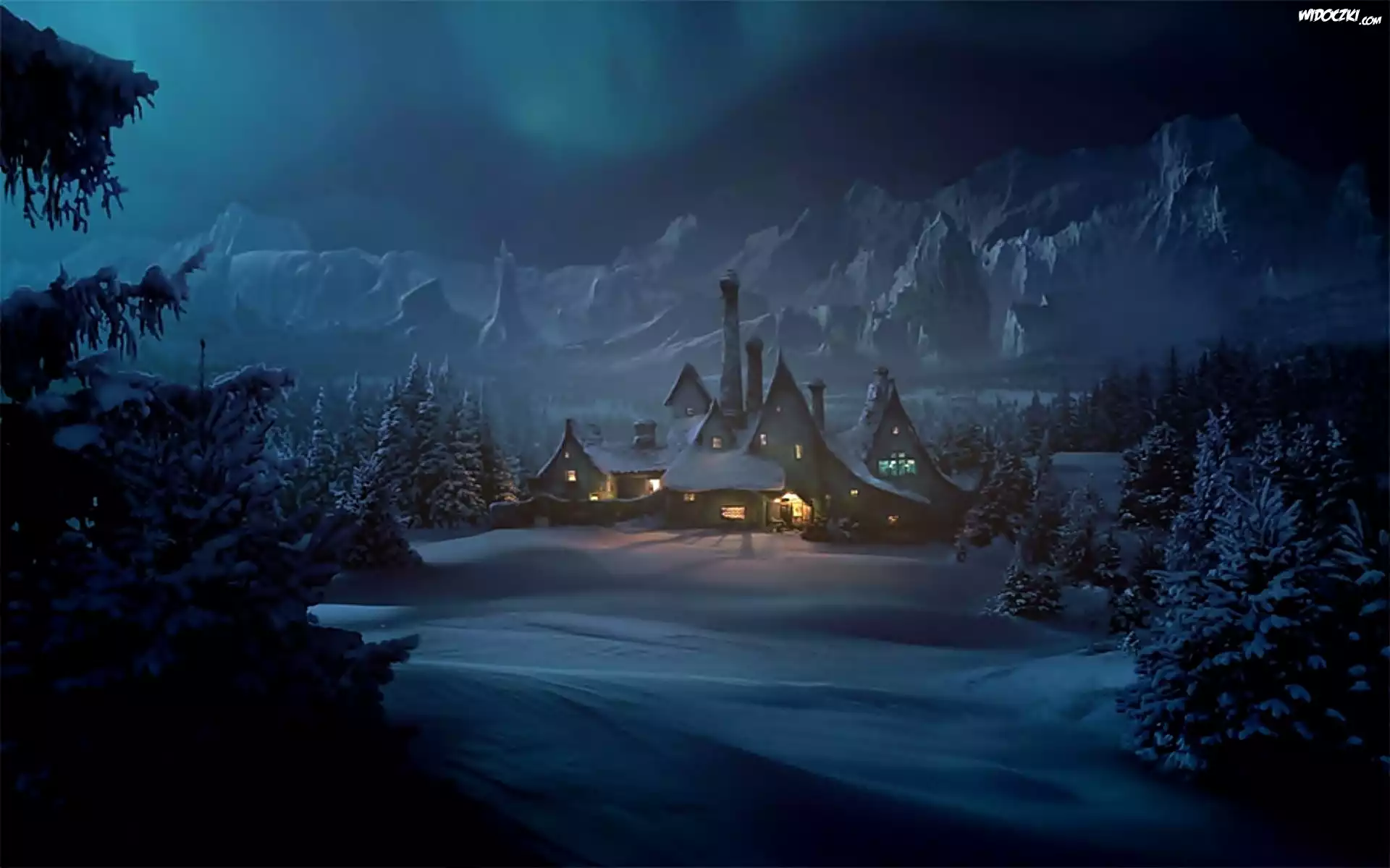 Zdjęcia, Zima, Noc, Drzewa, Góry, Domy, Śnieg