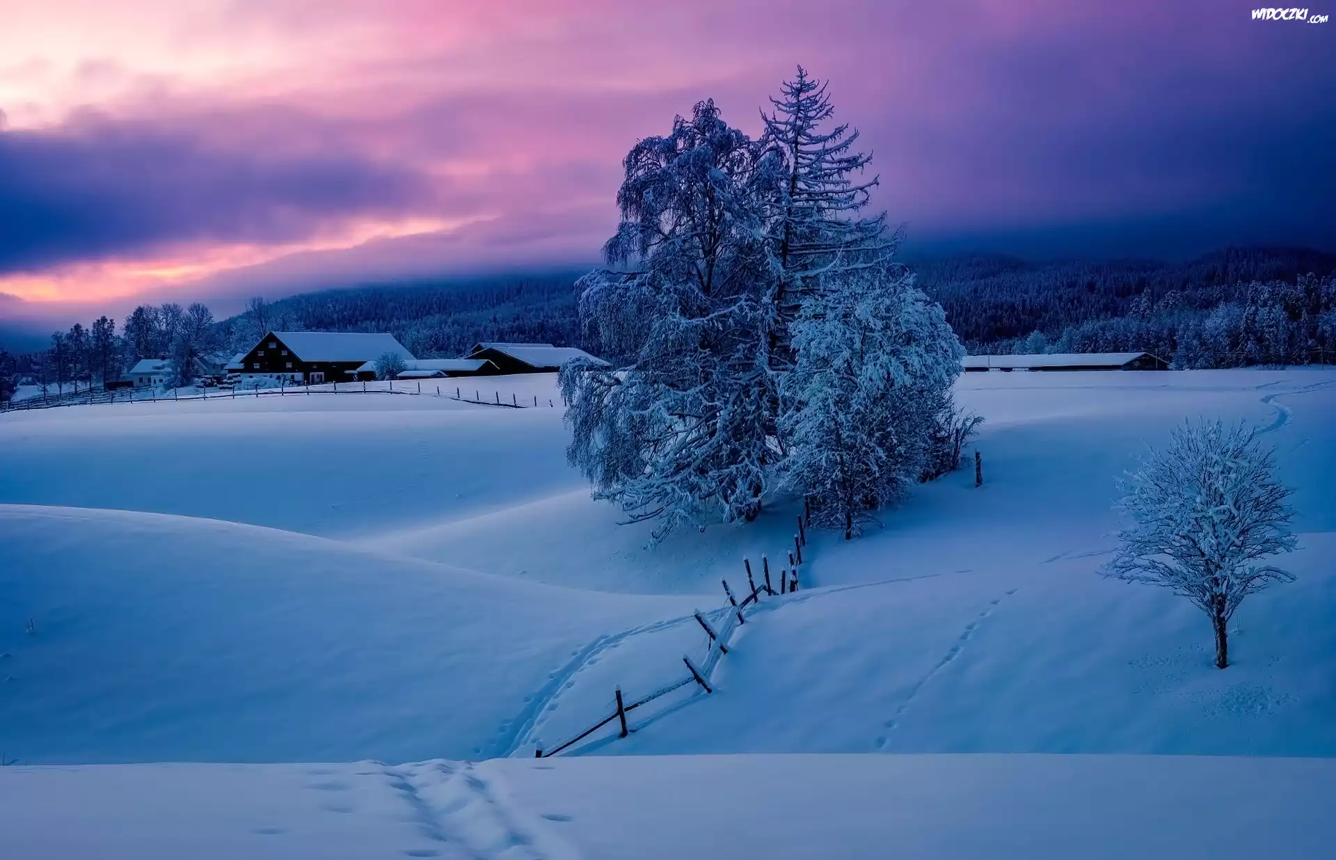 Zdjęcia, Zima, Góry, Drzewa, Domy, Ogrodzenie