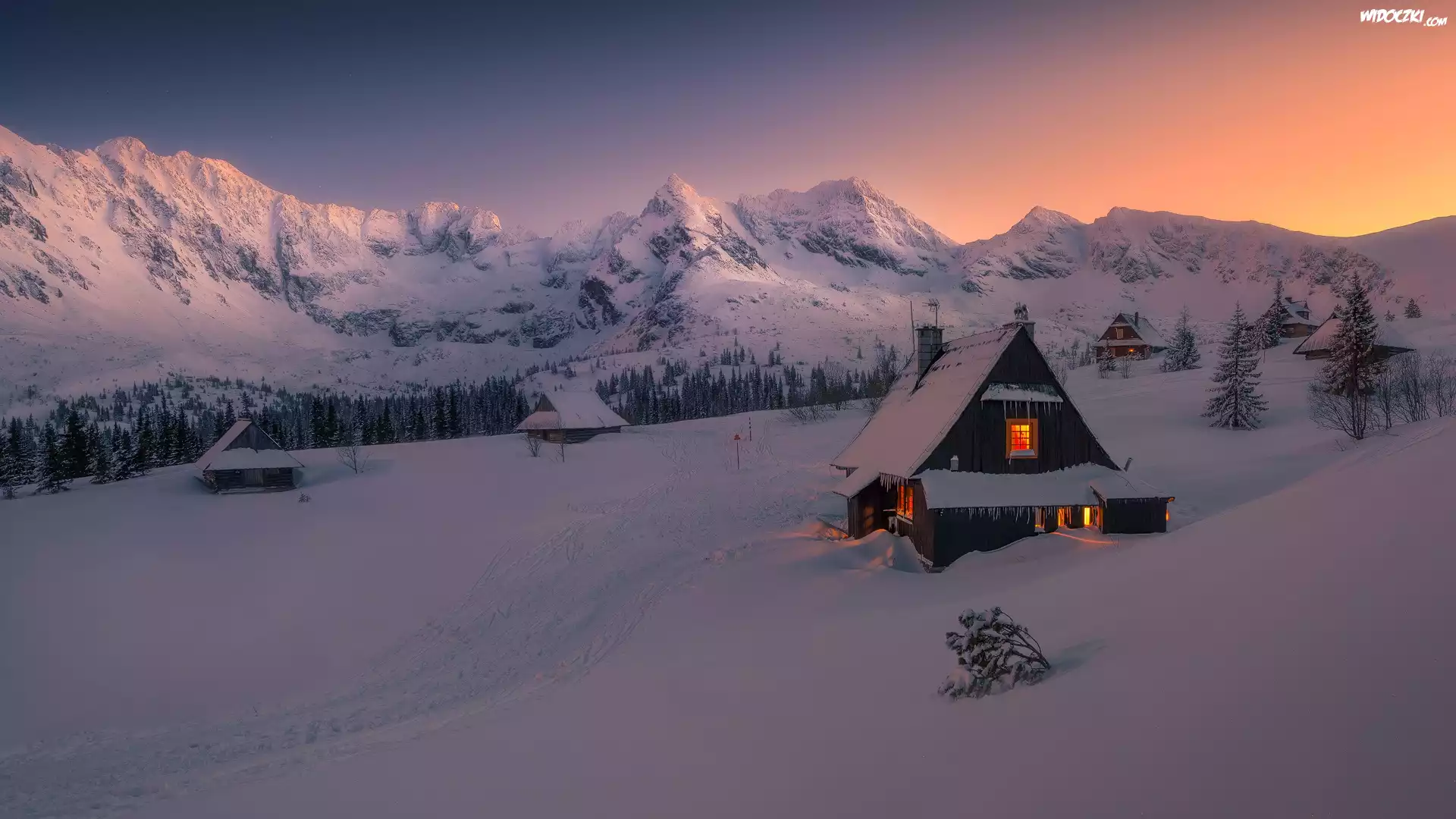 Zdjęcia, Zima, Śnieg, Góry, Domy, Wieczór