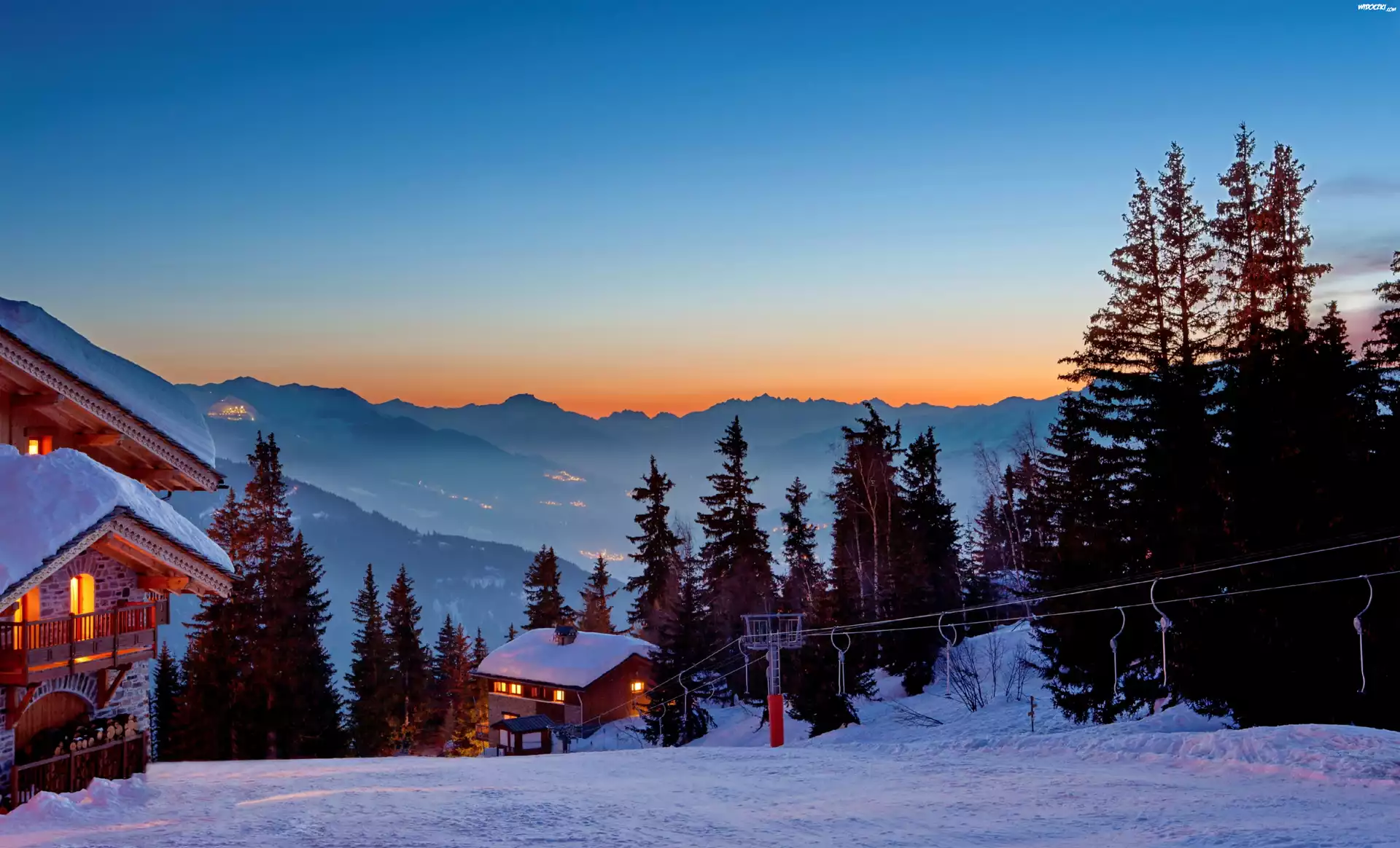 Zdjęcia, Zima, Góry, Oświetlone, Domy, Zmrok