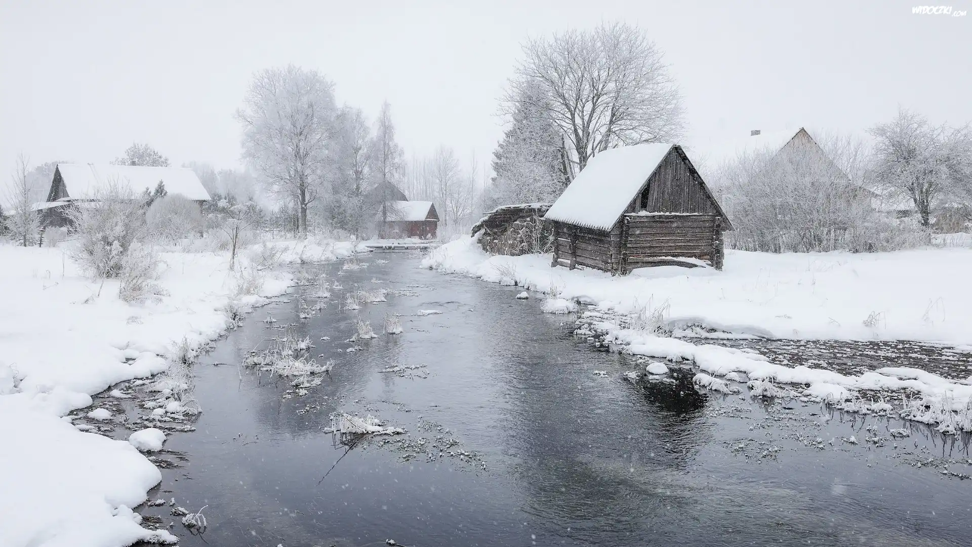 Zdjęcia, Domy, Drzewa, Rzeka, Zima