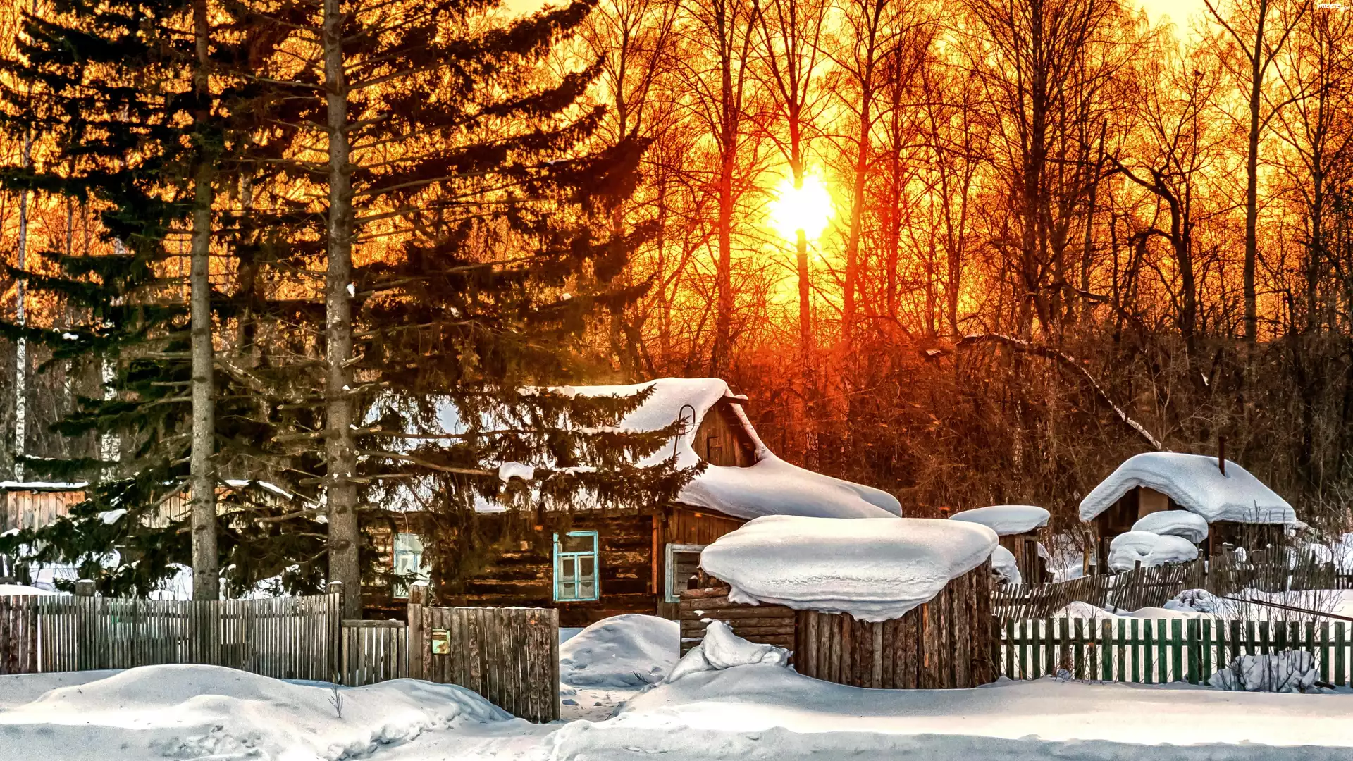 Zdjęcia, Zima, Zachód Słońca, Drzewa, Domy, Ogrodzenie