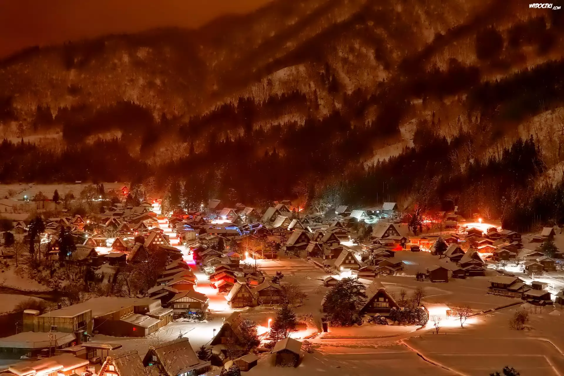 Zdjęcia, Zima, Śnieg, Wzgórza, Noc, Domy, Wioska