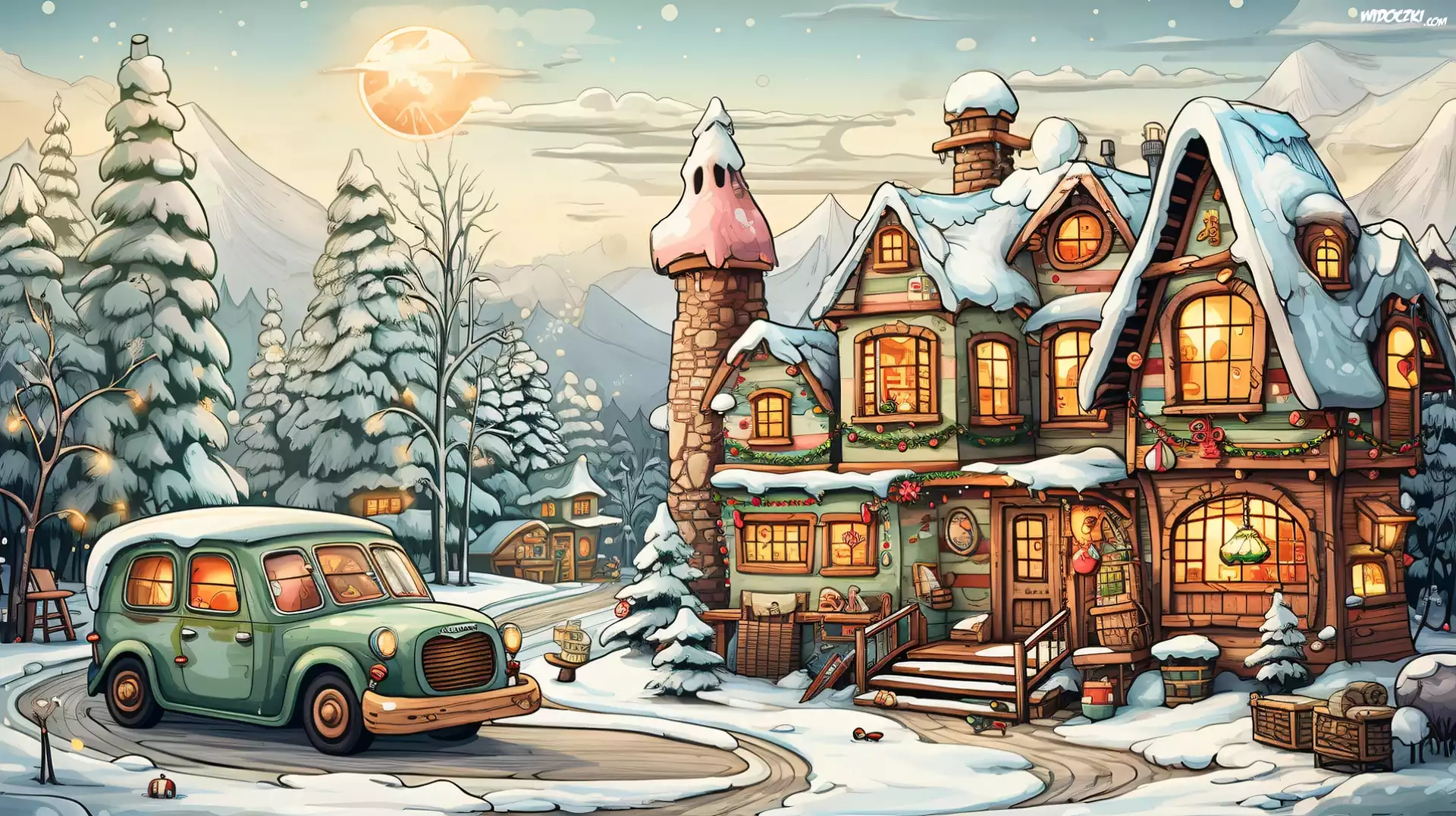 Zima, Góry, Drzewa, Śnieg, Oświetlone, Domy, Droga, Samochód, Grafika