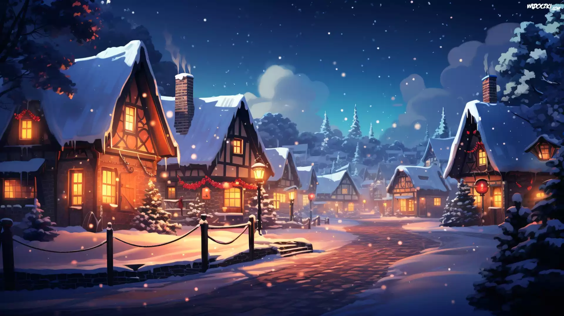 Zdjęcia, Zima, Noc, Oświetlone, Domy, Choinki, Latarnia, Droga, Śnieg, Grafika