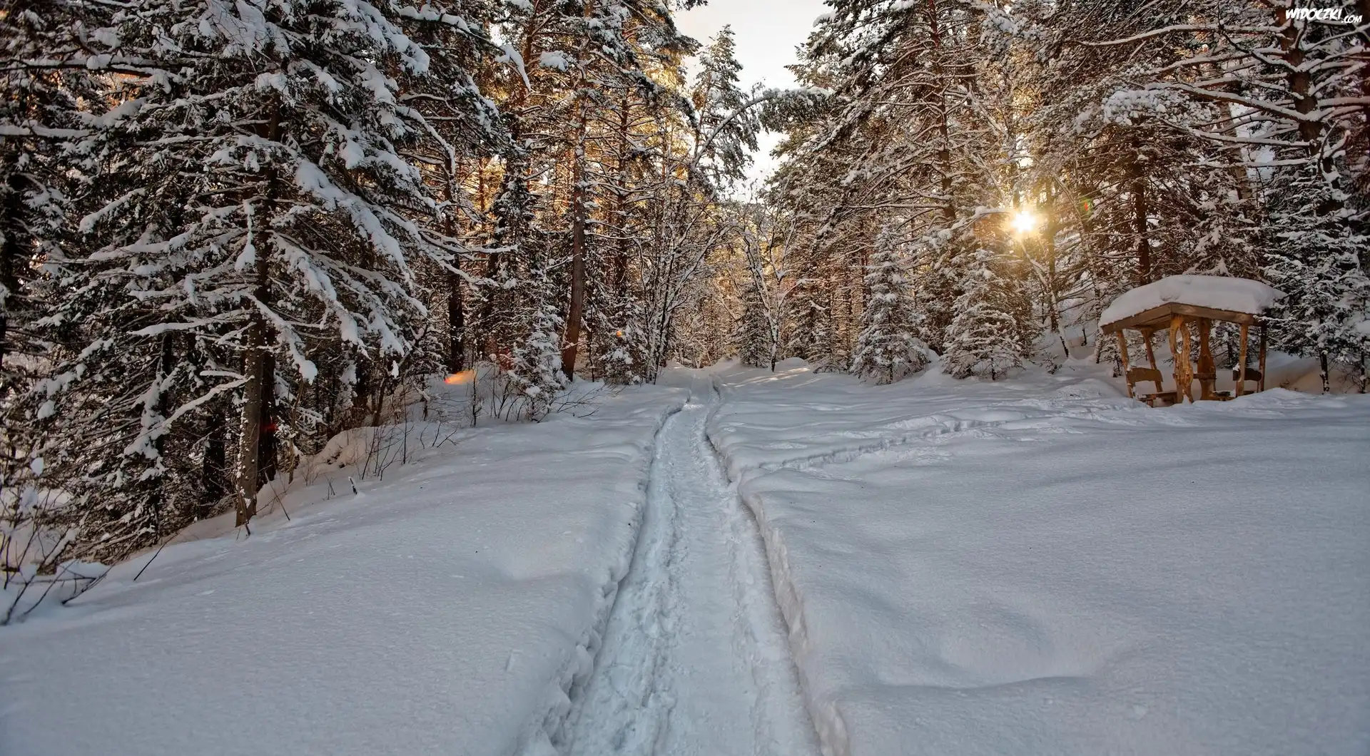Zdjęcia, Zima, Las, Przebijające światło, Droga, Altanka