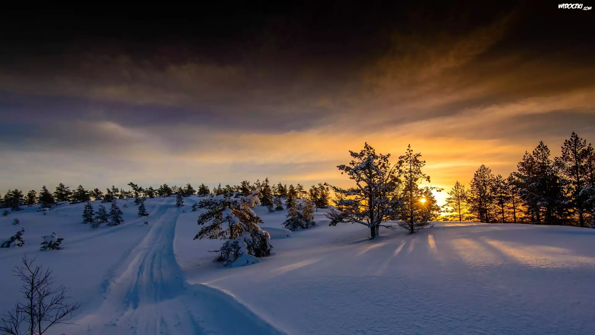 Zdjęcia, Zima, Zachód Słońca, Droga, Drzewa