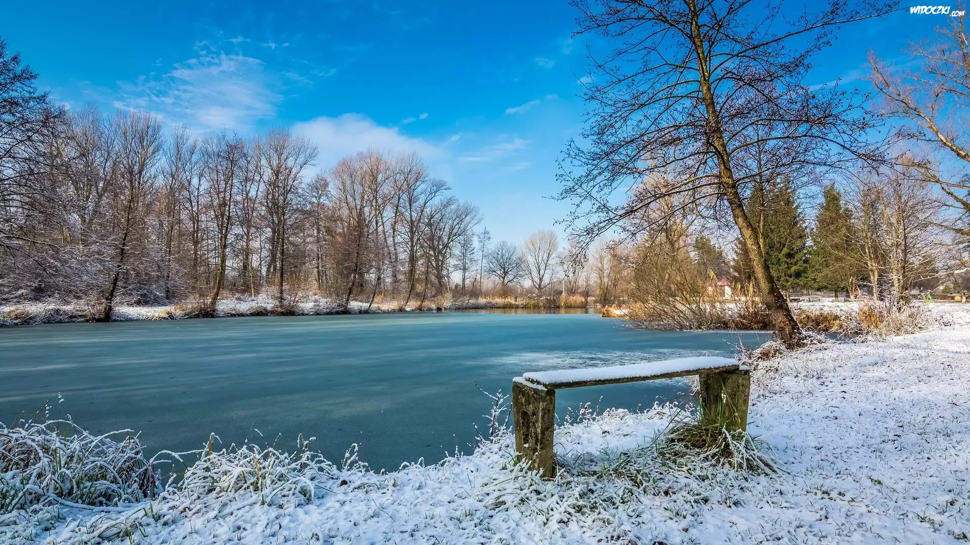 Zdjęcia, Zima, Rzeka, Ławeczka, Drzewa, Śnieg