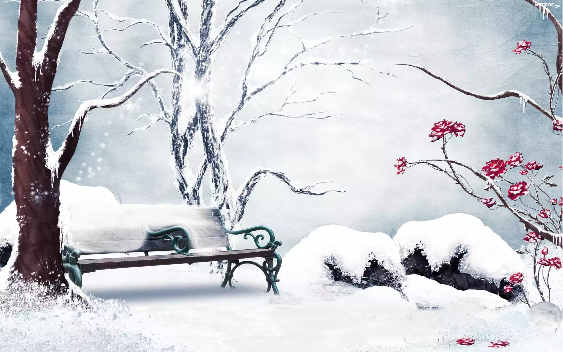 Zdjęcia, Ławka, Drzewa, Zima, Grafika