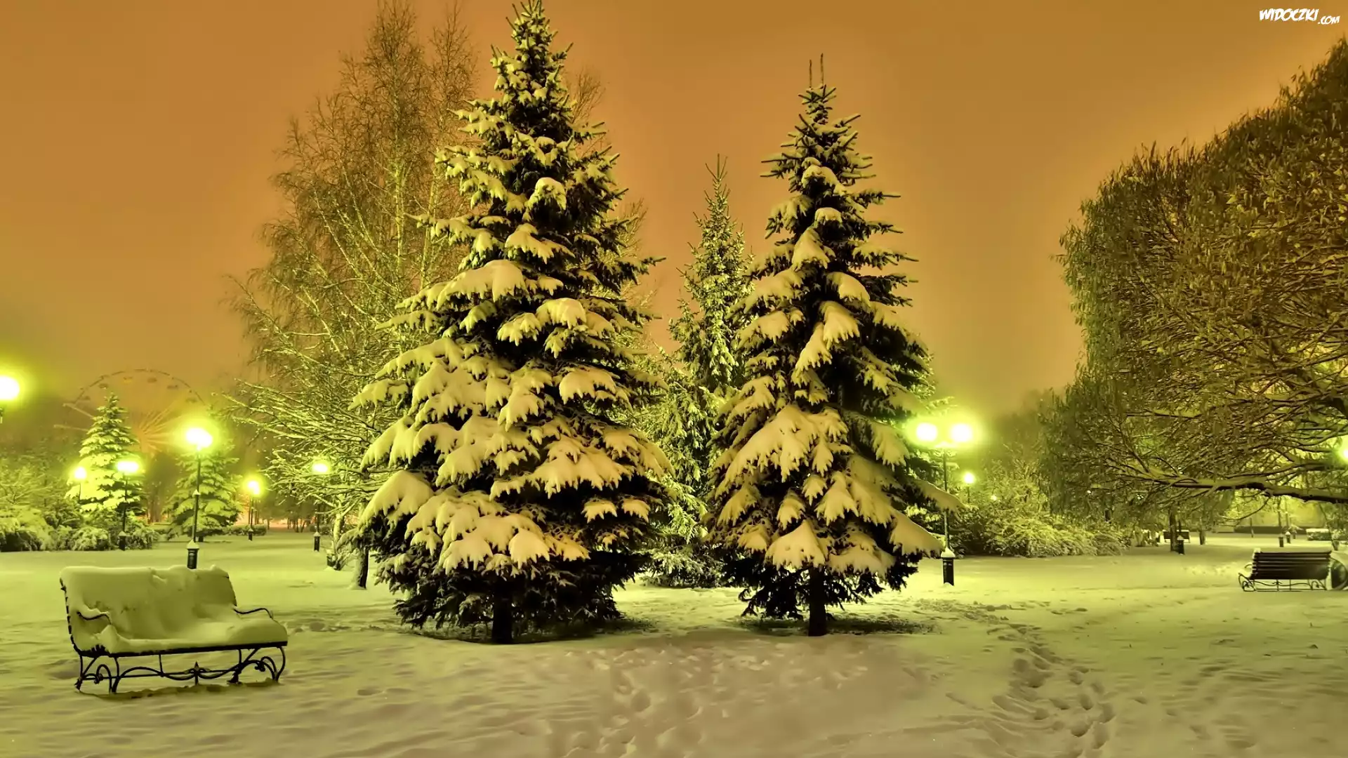 Zdjęcia, Zima, Park, Ławka, Ośnieżone, Drzewa, Latarnie