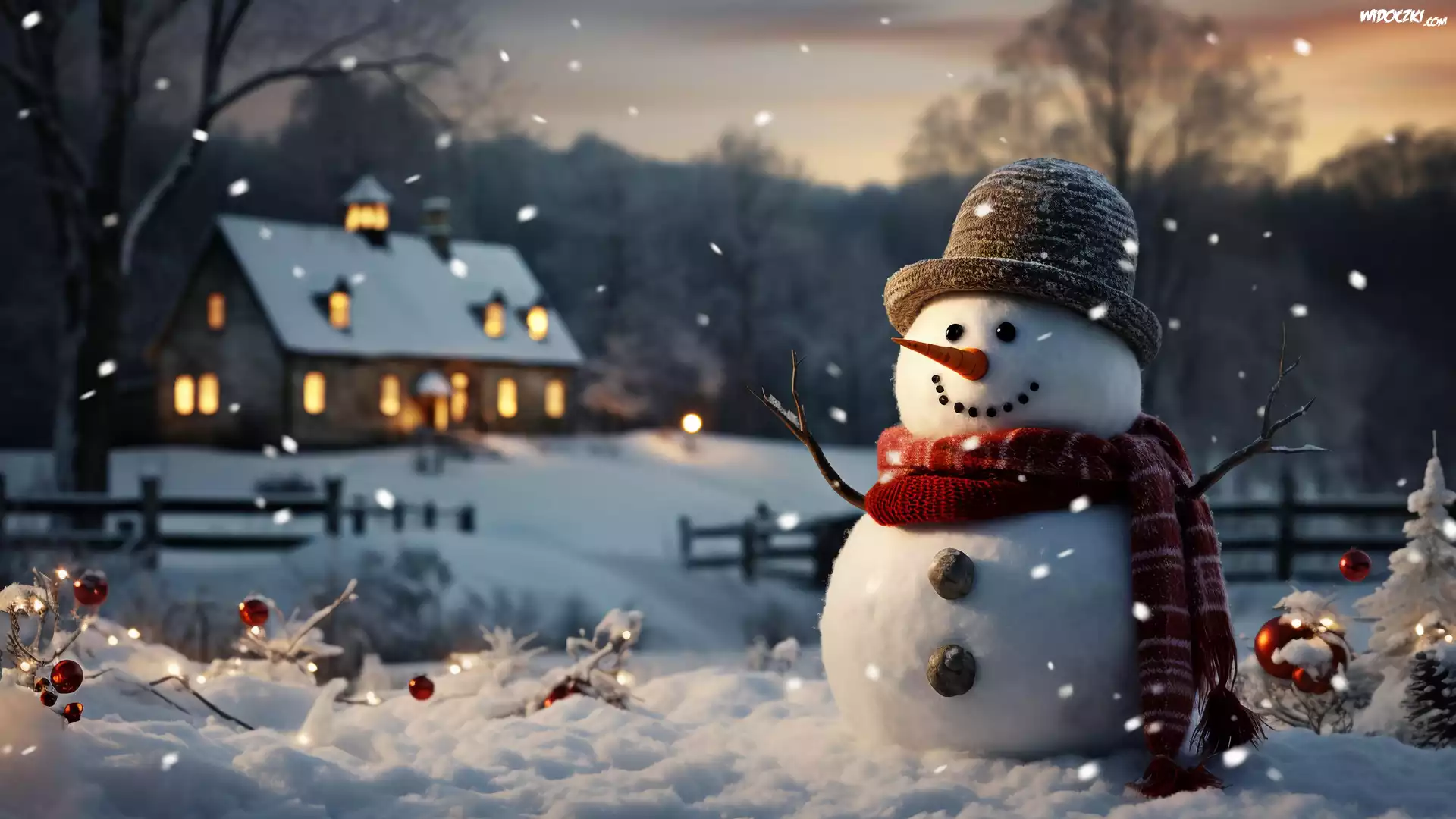 Zdjęcia, Zima, Śnieg, Bałwan, Szalik, Kapelusz, Bombki, Oświetlony, Dom, Drzewa, Grafika