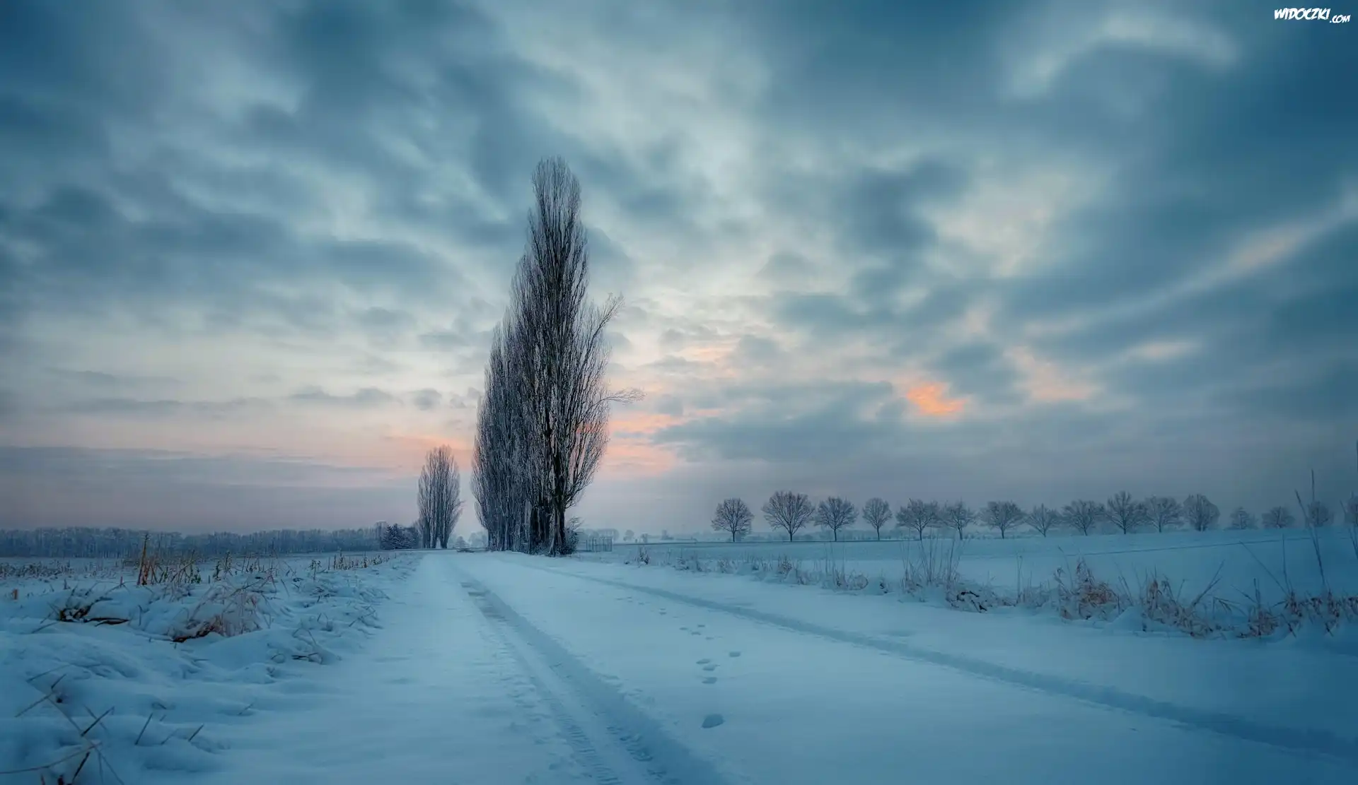 Zdjęcia, Zima, Pola, Droga, Drzewa, Topole