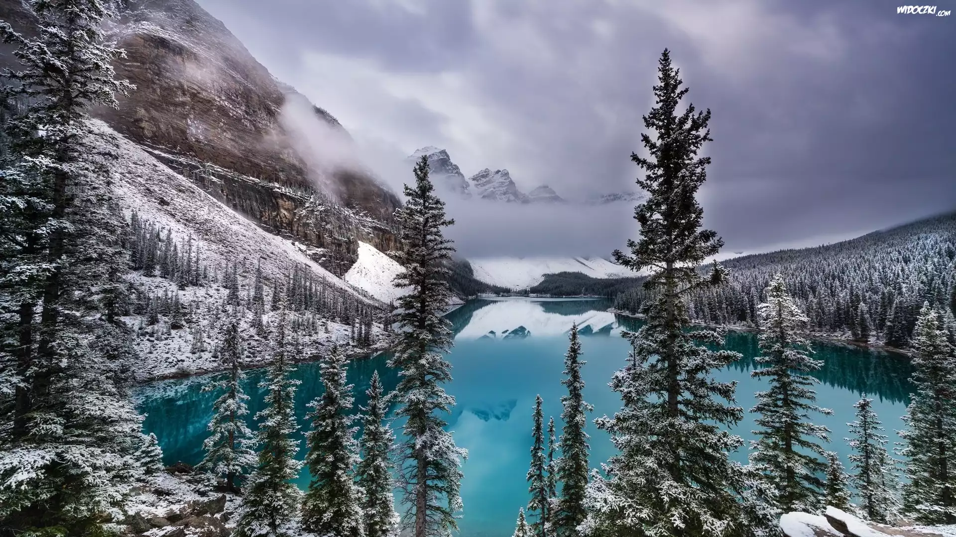 Zima, Jezioro, Góry, Drzewa, Mgła
