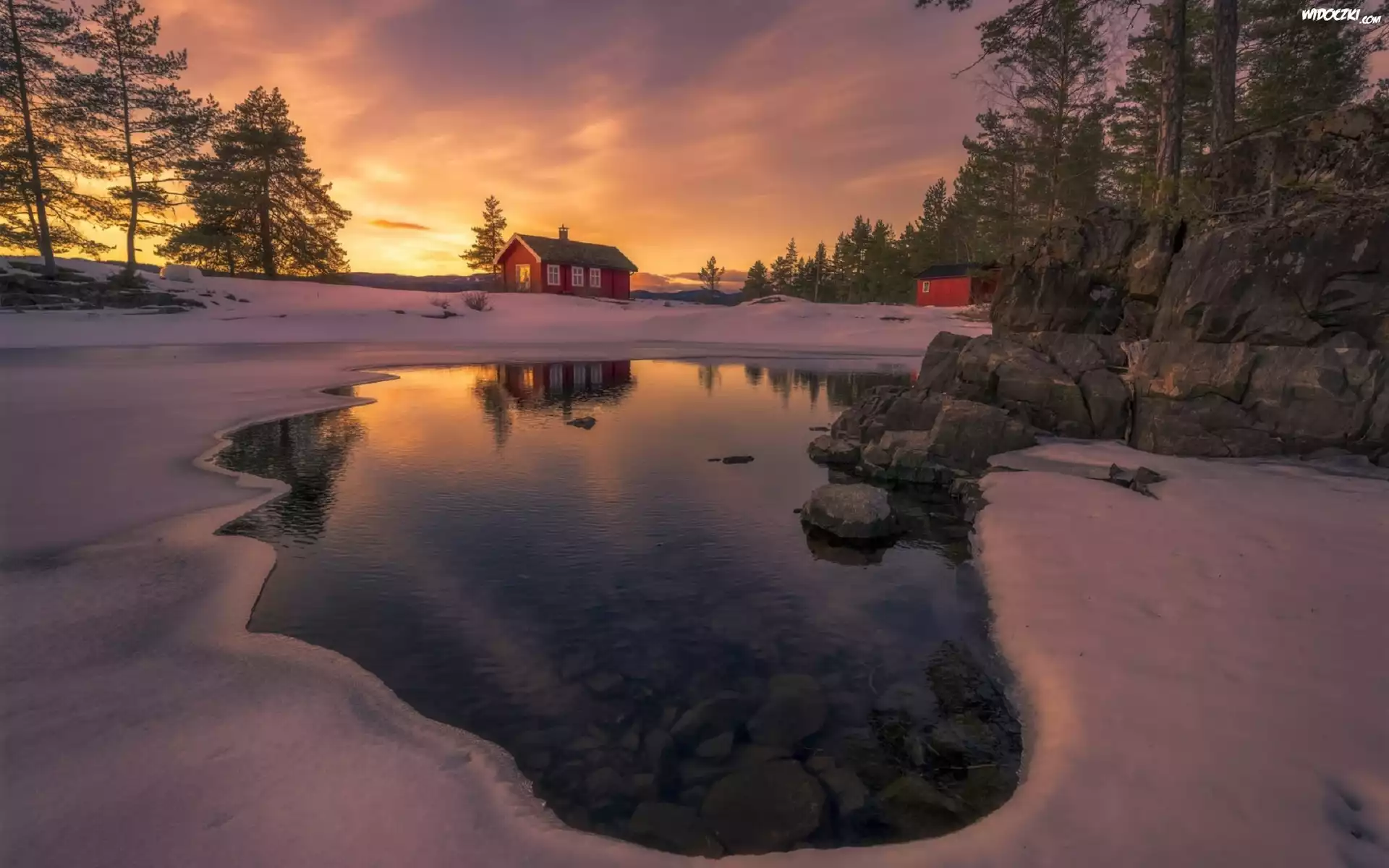 Zdjęcia, Zima, Zamarznięte, Jezioro, Domki, Drzewa, Kamienie