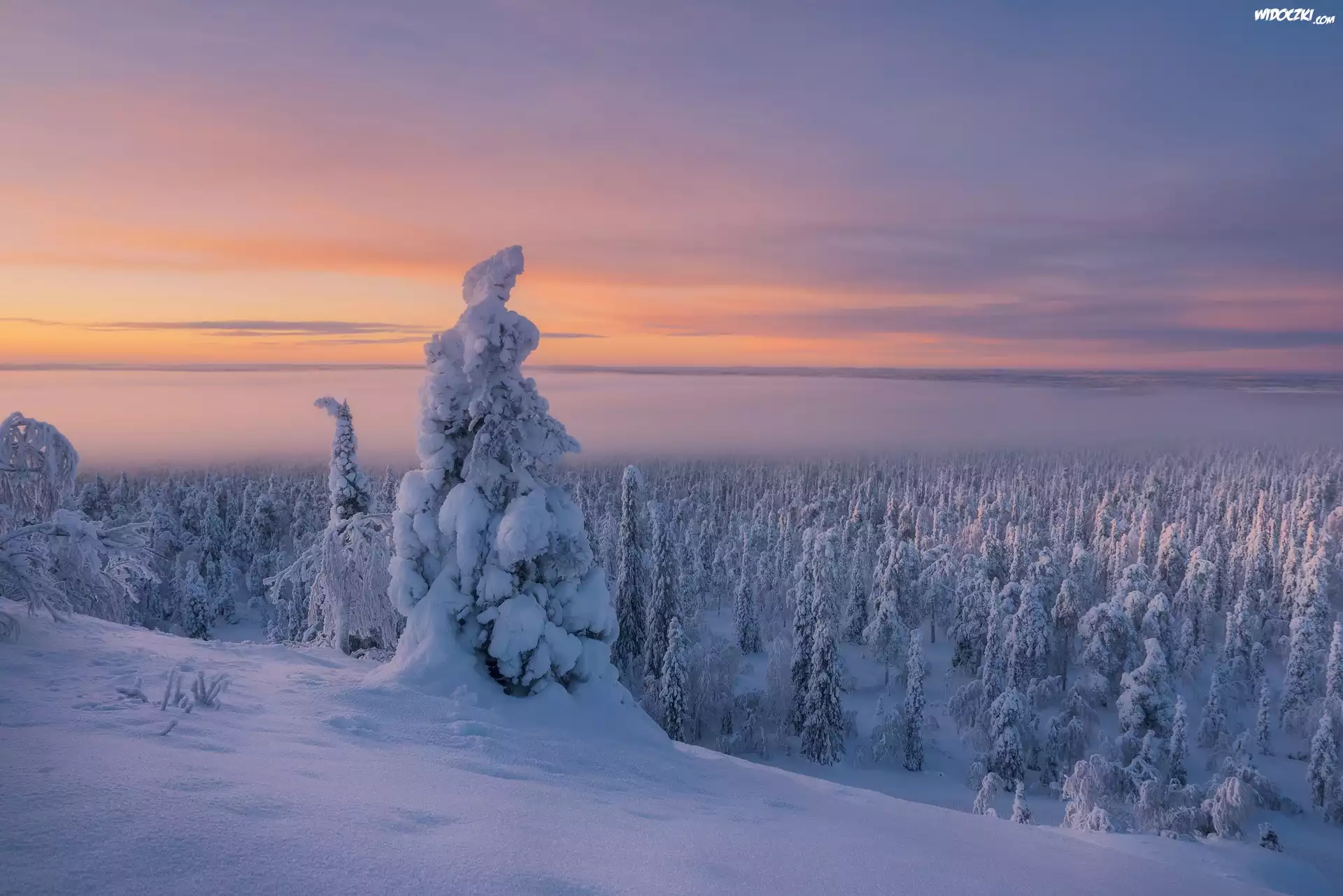 Zdjęcia, Zima, Finlandia, Laponia, Ośnieżone, Drzewa, Mgła