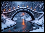 Zima, Noc, Rzeka, Dwa, Mosty, Latarnie, Drzewa, Åšnieg, AI