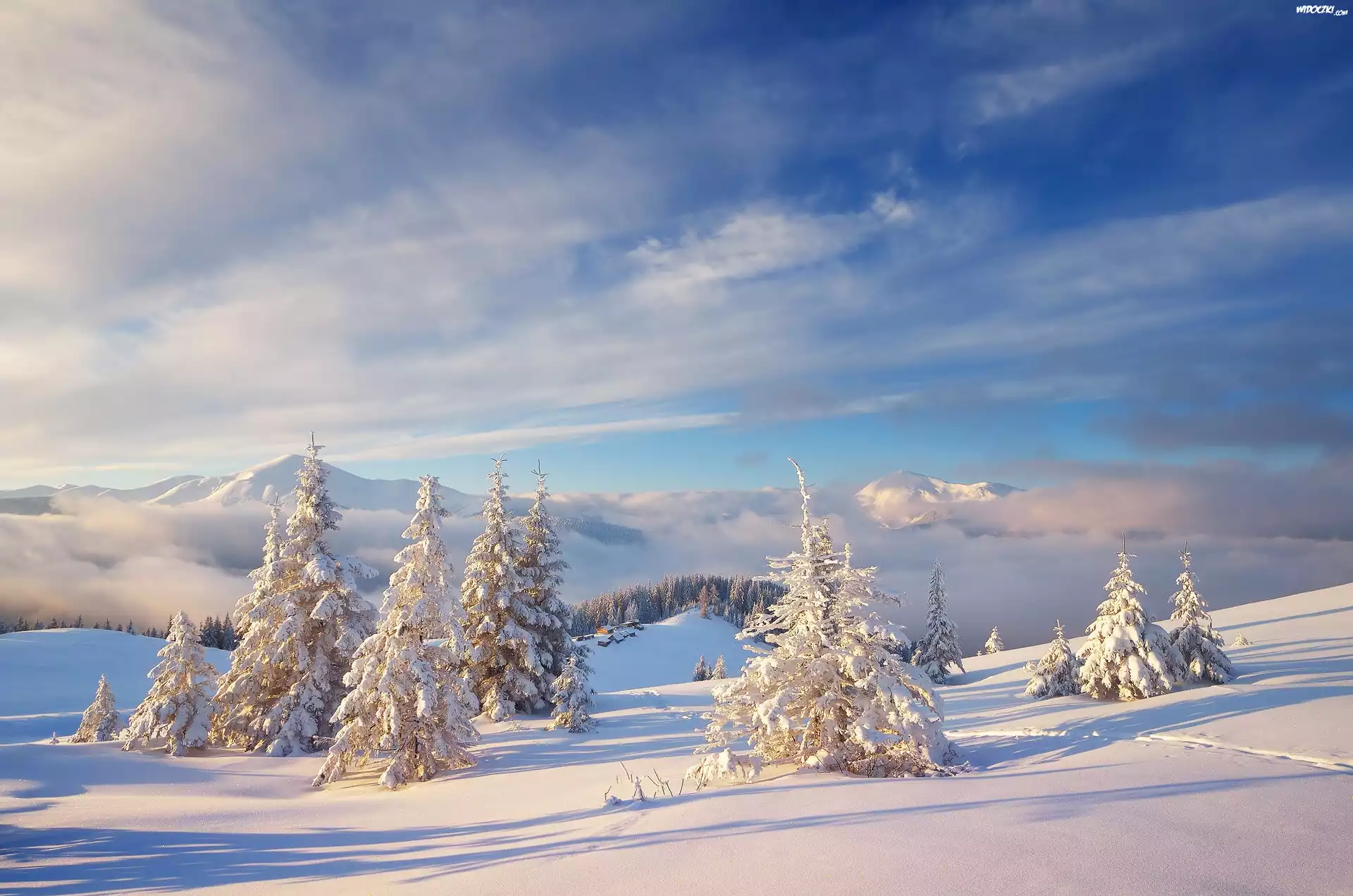 Zima, Góry, Śnieg, Drzewa, Iglaste