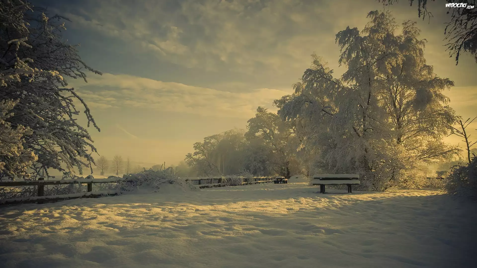 Zdjęcia, Zima, Mróz, Śnieg, Drzewa, Ławka