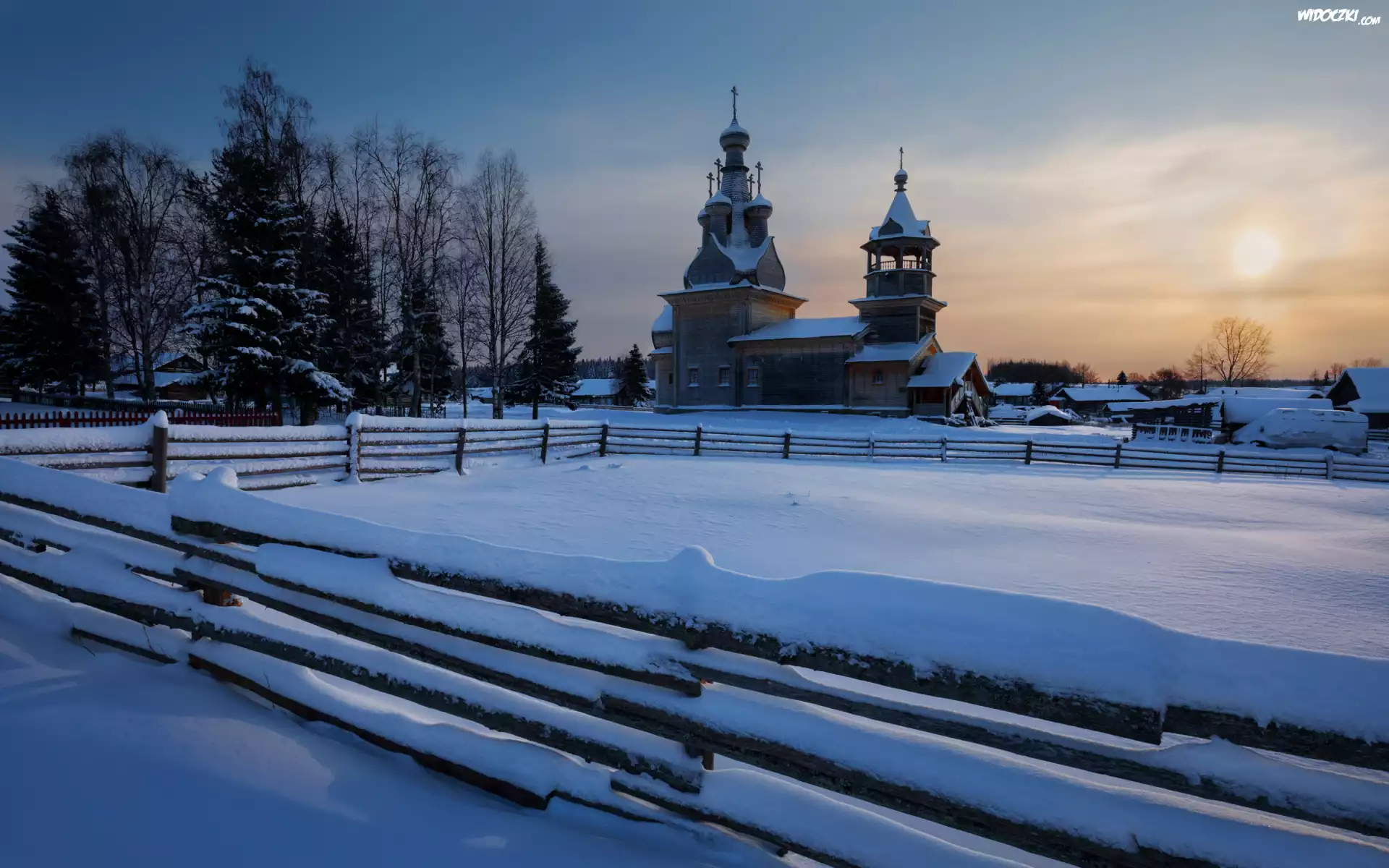Zima, Cerkiew, Ogrodzenie, Śnieg, Drzewa, Poranek