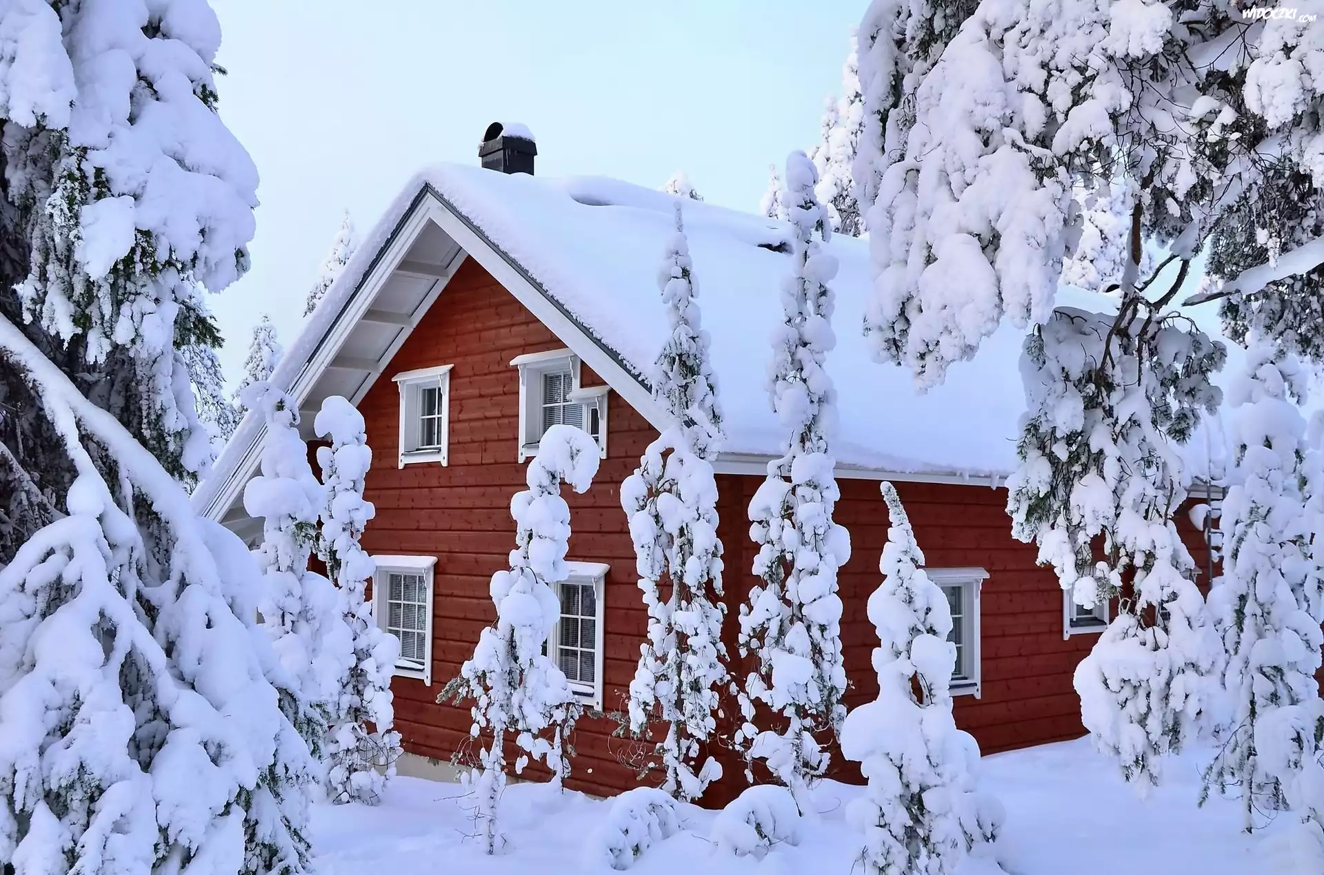 Zdjęcia, Zima, Ośnieżone, Drzewa, Dom