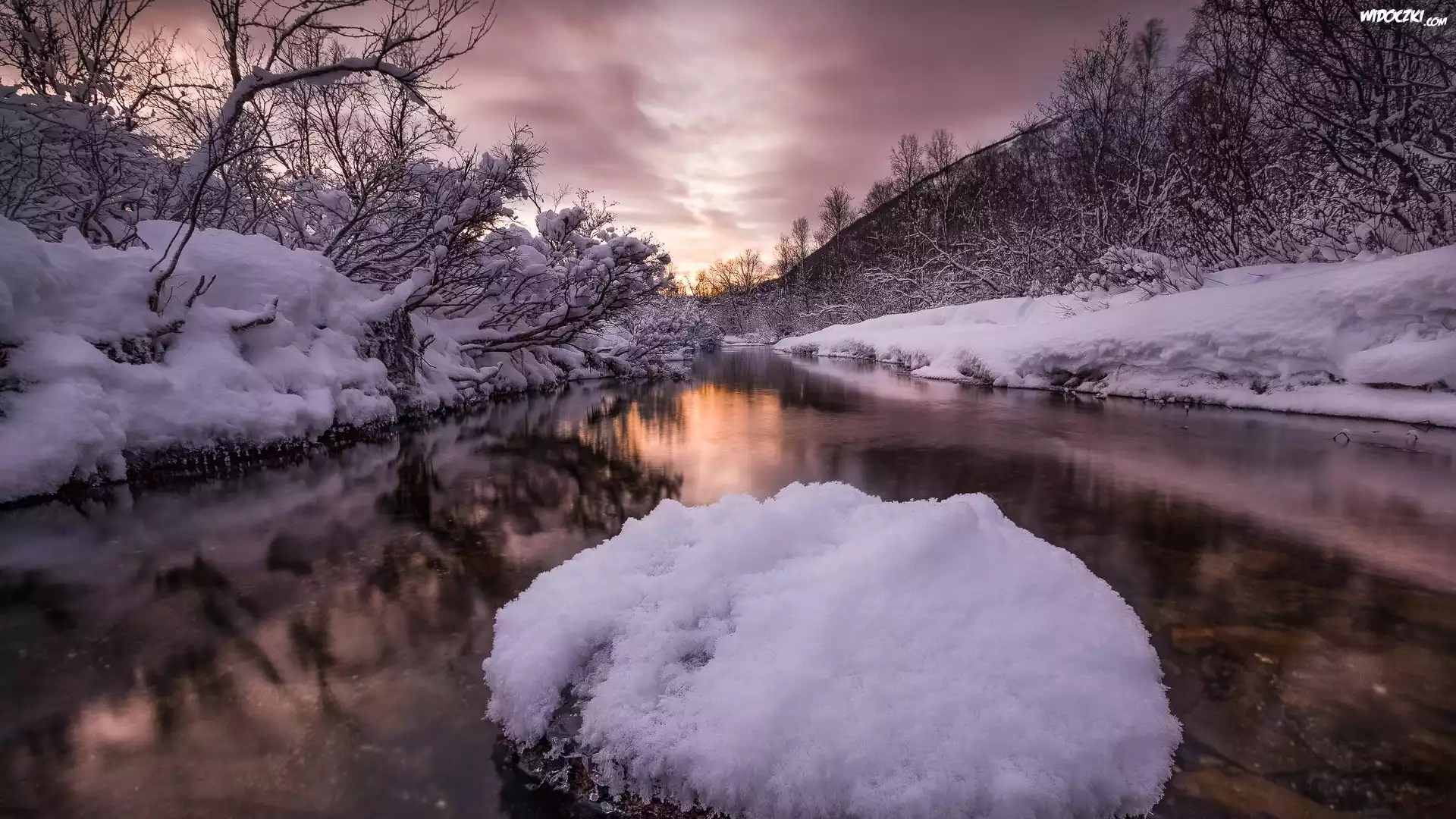 Zima, Rzeka, Ośnieżone, Gałęzie, Drzewa, Chmury